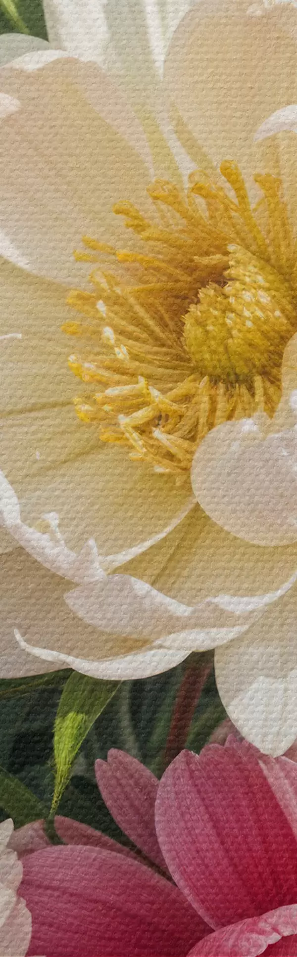 Vászonkép Egy csokor élénk bazsarózsa virágokból, rózsaszín, fehér és sárga különböző árnyalataiban, festékfoltokkal Nr s40403