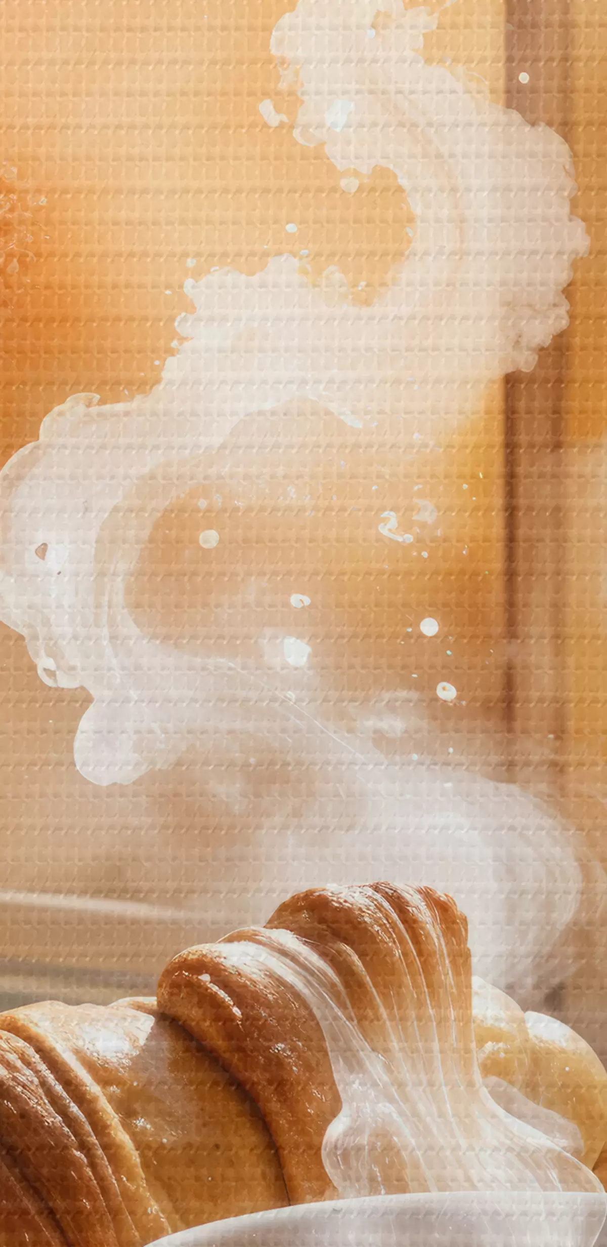 Vászonkép Egy meleg csésze kávé felszálló gőzzel, egy asztalon egy croissant mellett, kilátással egy történelmi épületre Nr s40405