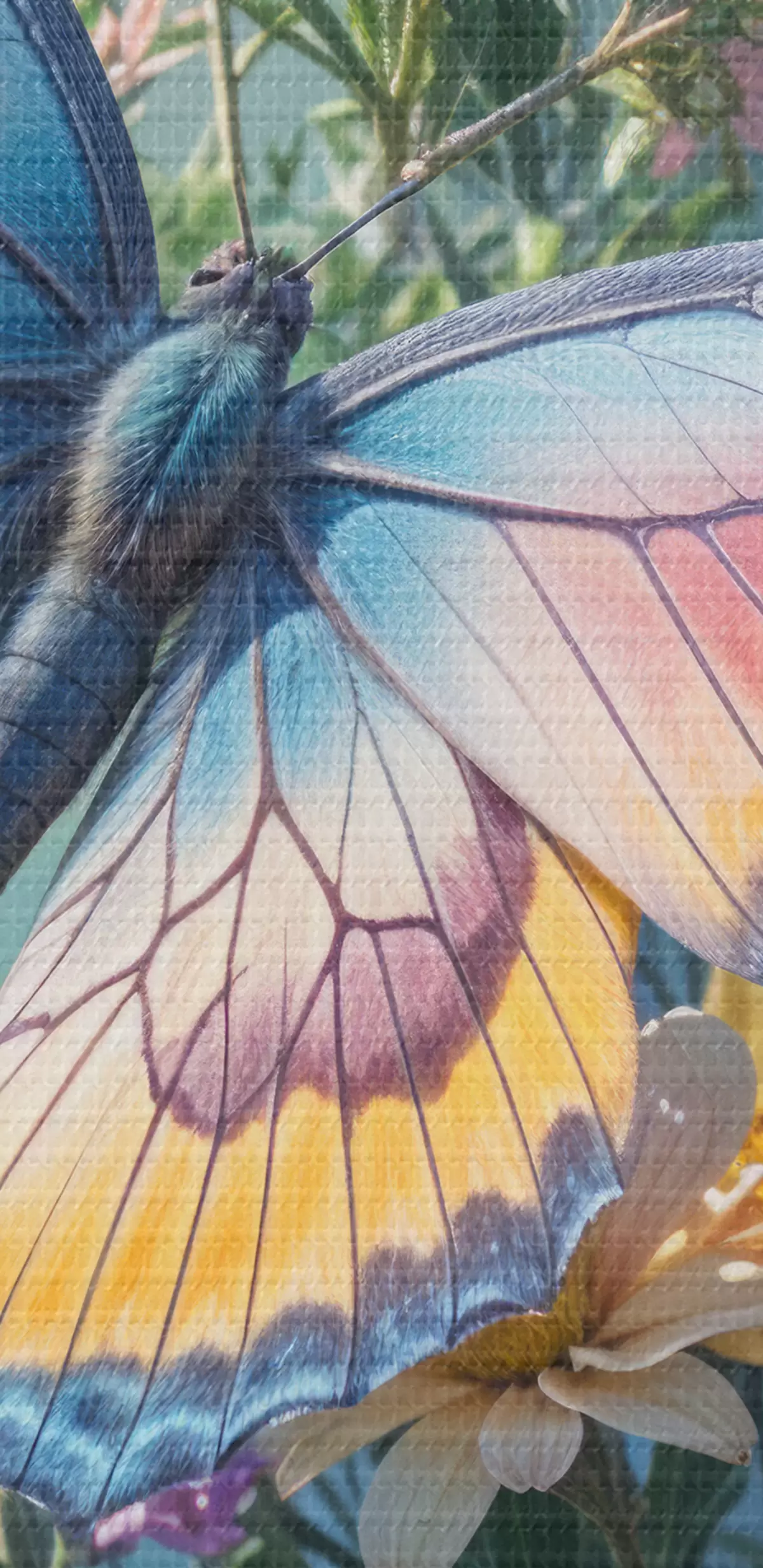 Vászonkép Egy nagy, színes pillangó egy rózsaszín és sárga virágcsokoron ült, sötétzöld háttér előtt Nr s40411