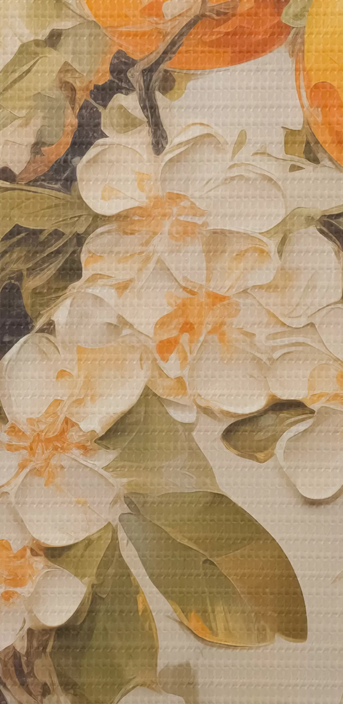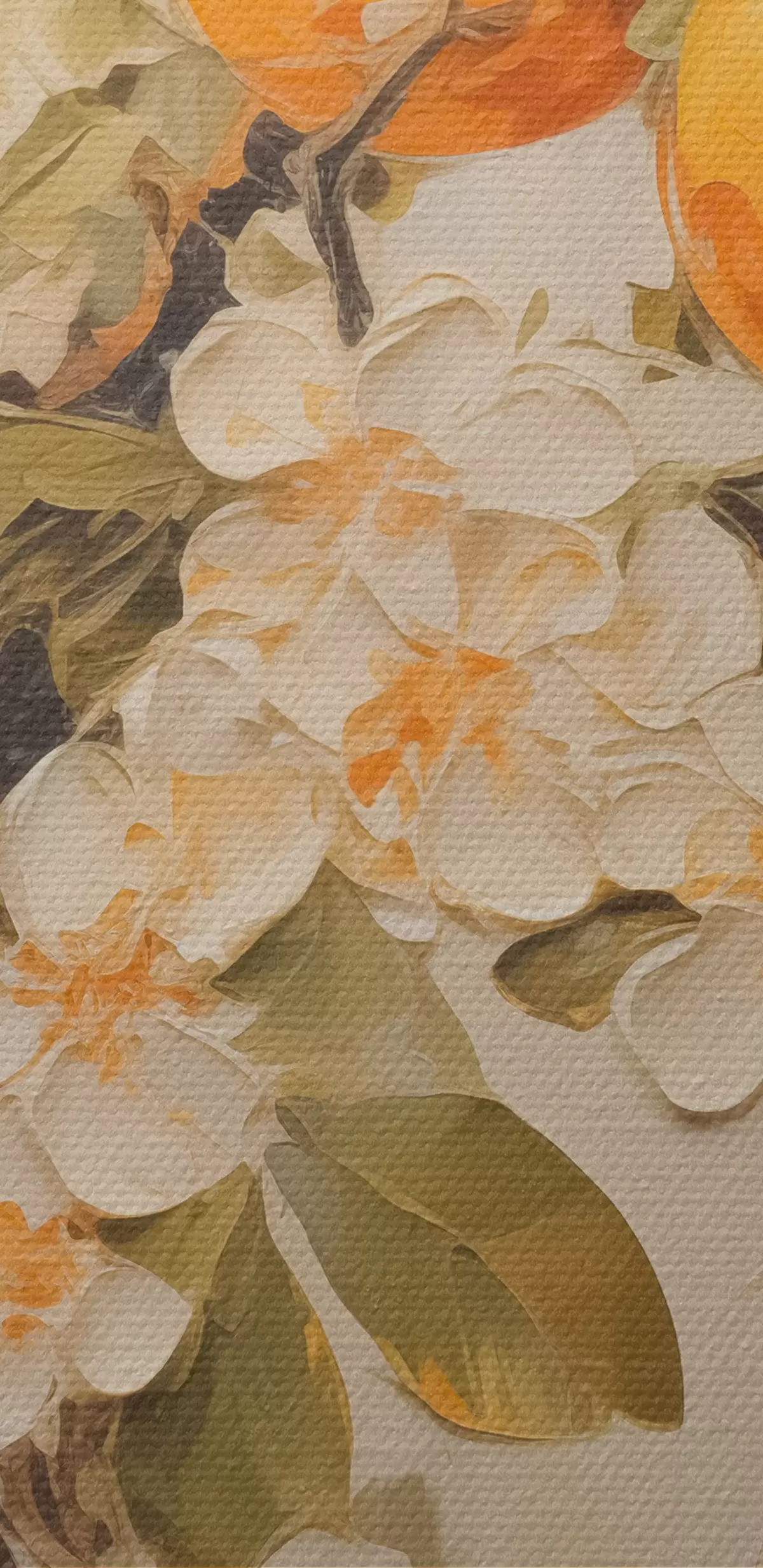 Vászonkép Szürke-bézs alapon fehér virágokkal és narancssárga ág Nr s40486