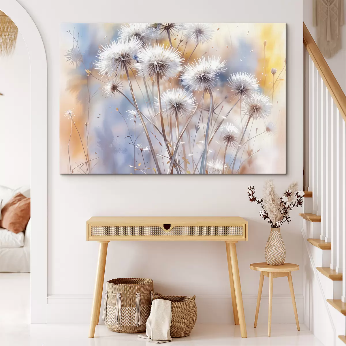 Vászonkép Bolyhos fehér pitypang virágok elmosódott akvarell háttéren meleg világítással Nr s40541