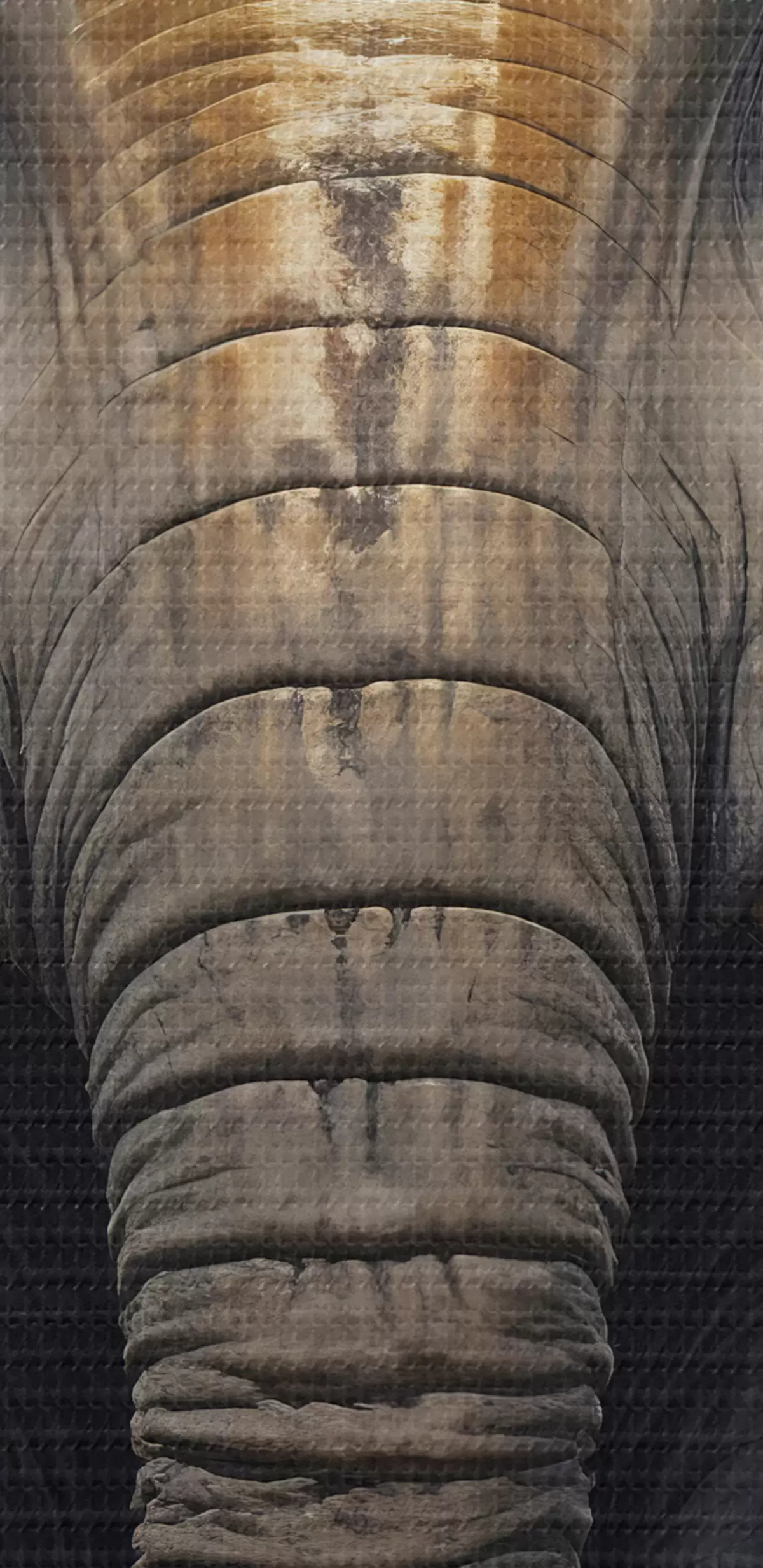 Vászonkép Nagy, texturált afrikai elefántfestmény elefántcsont agyarral és kiszélesedő fülekkel, fa háttér előtt Nr s40544