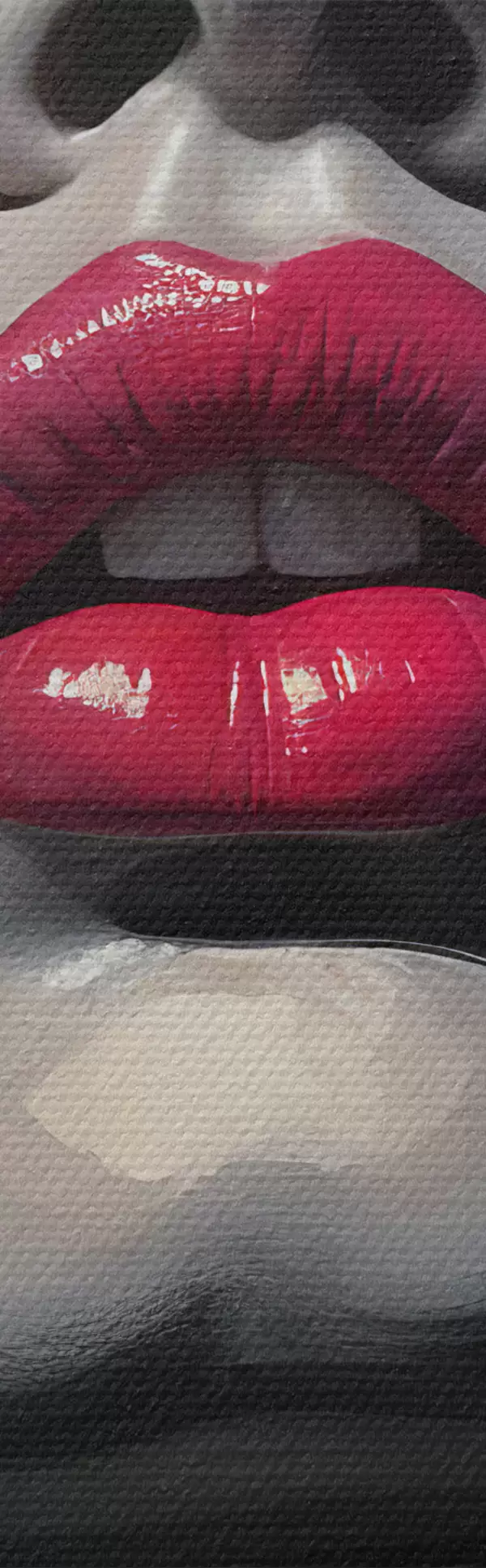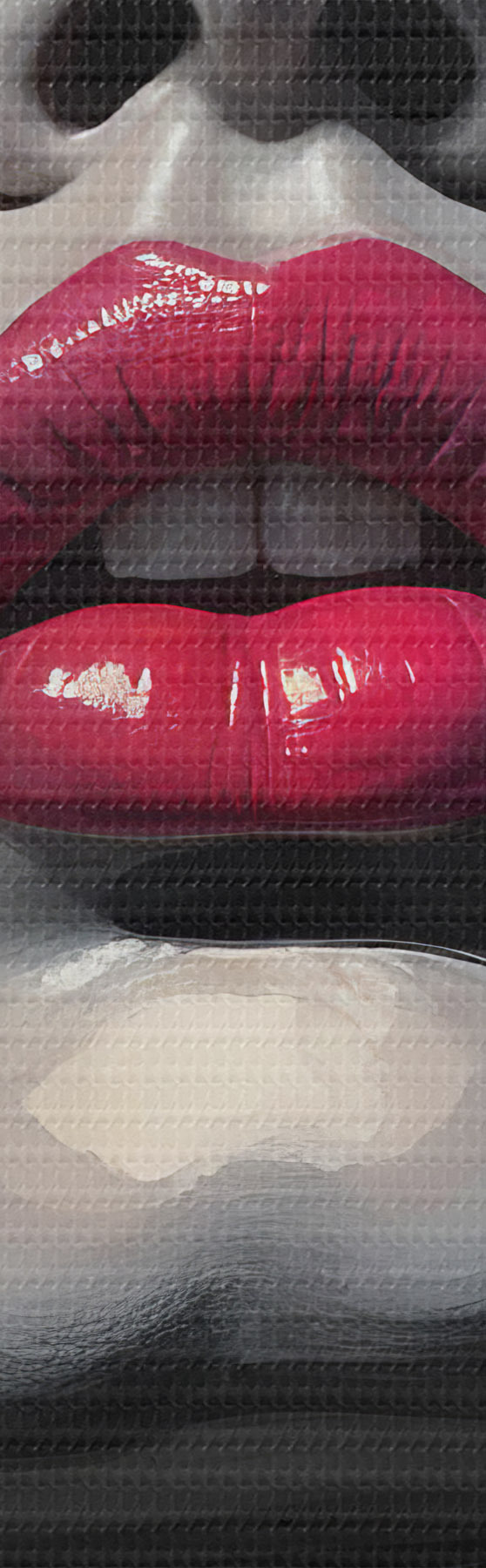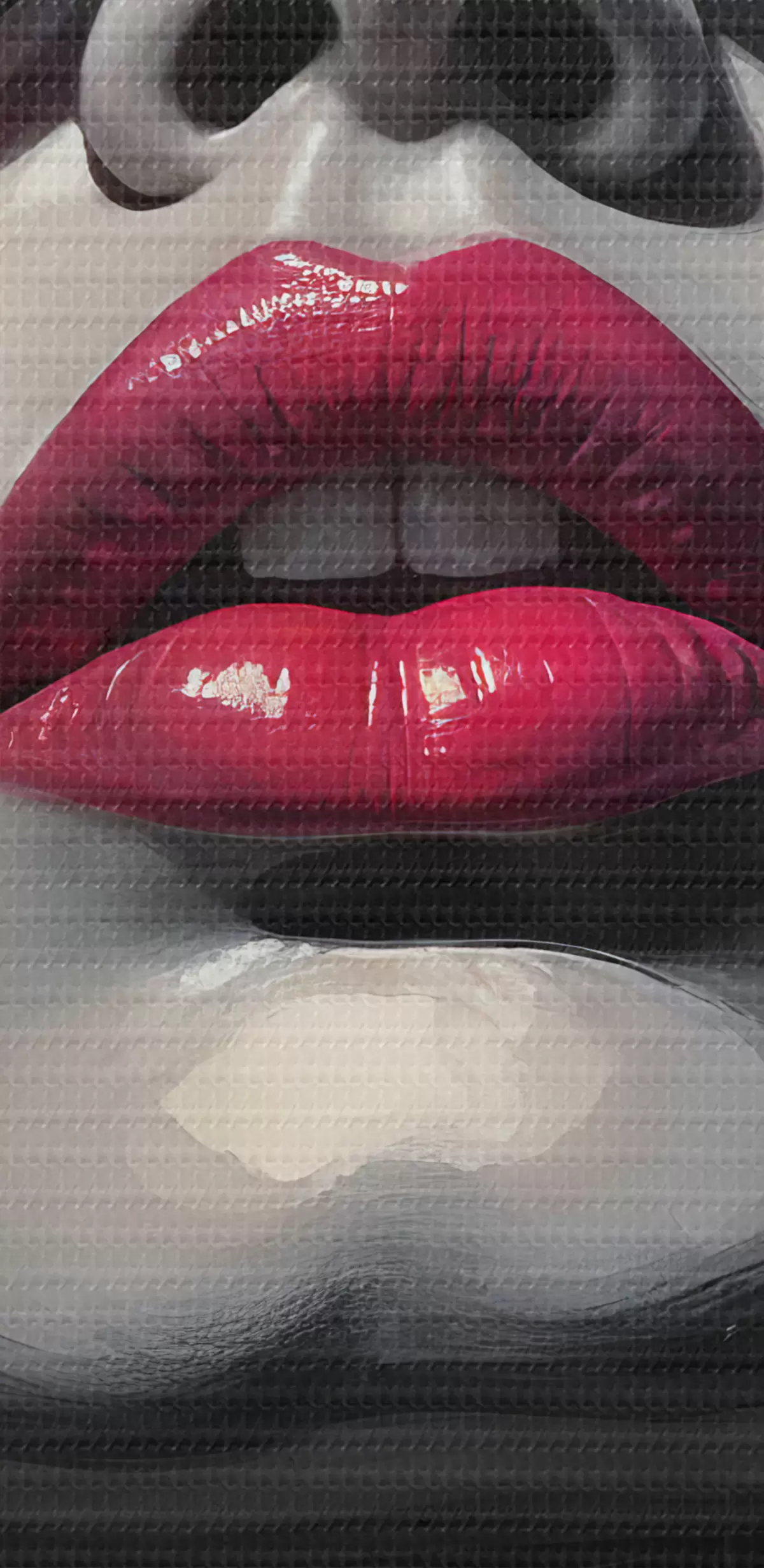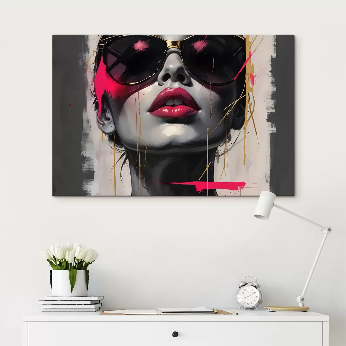 Vászonkép Egy fiatal nő absztrakt portréja napszemüvegben, rózsaszín ajkakkal, elvont formákkal és rózsaszín fröccsenéssel Nr s40558