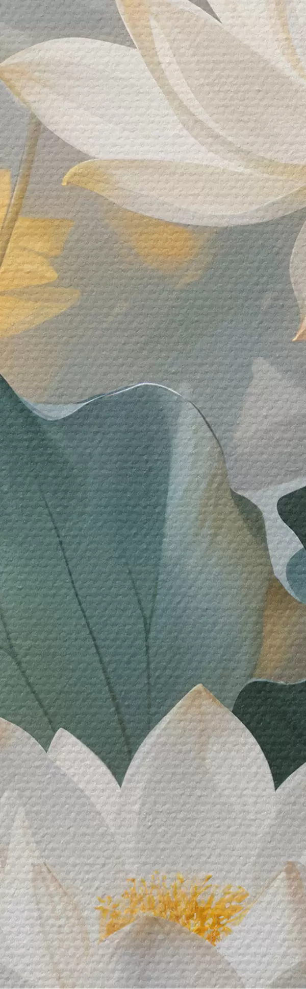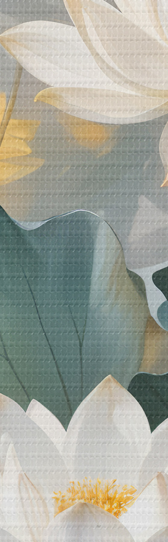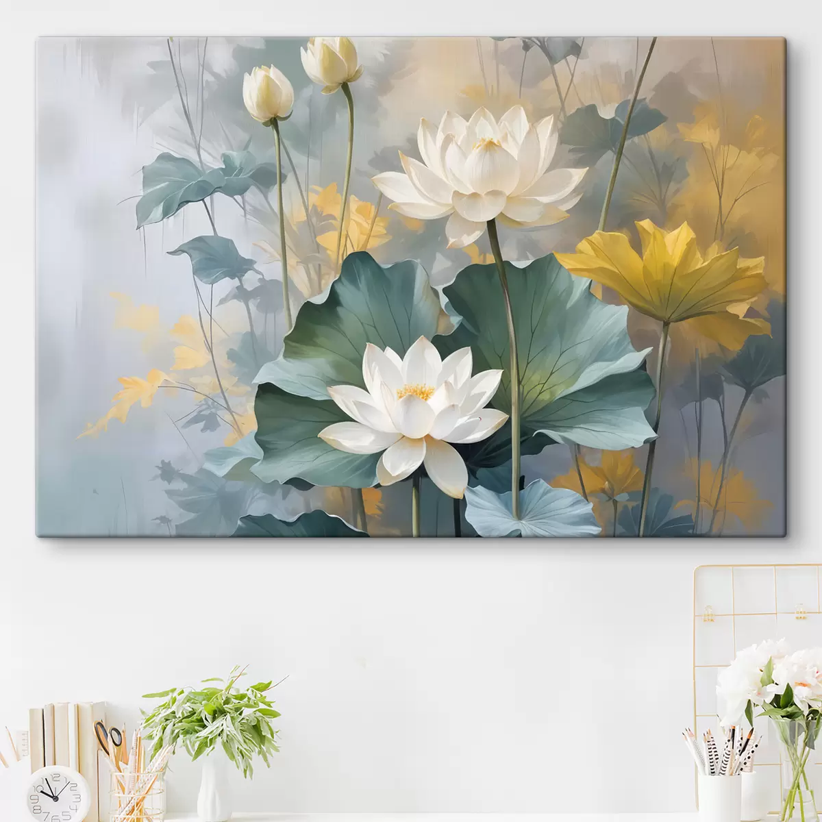 Vászonkép Fehér lótuszvirágok egy tóban zöld liliompárnákkal, sárga virágokkal és elmosódott háttérrel körülvéve Nr s40559
