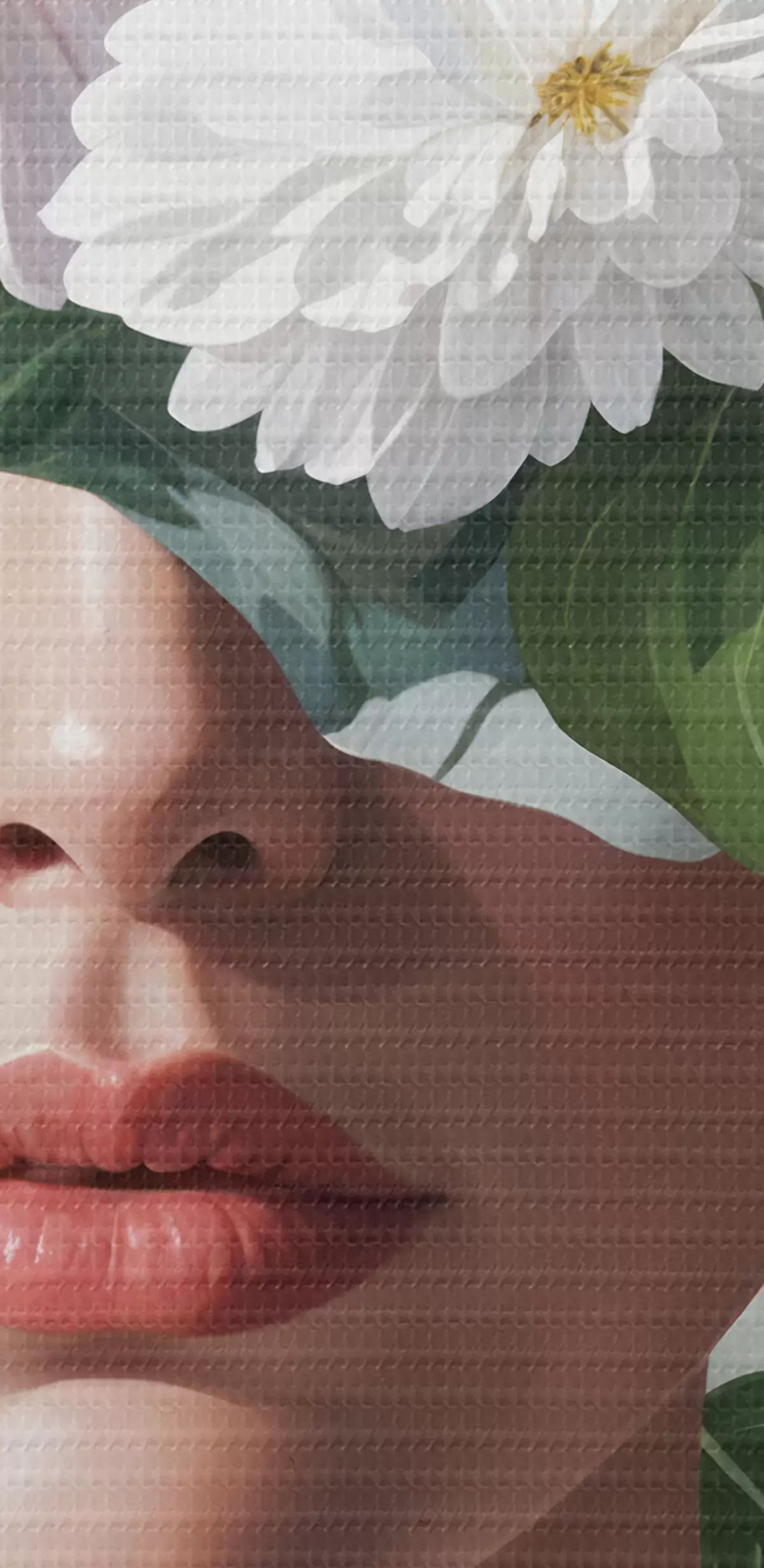 Vászonkép Egy nő, akit részben eltakar egy csokor rózsaszín és fehér virágok zöldellő, leveles háttér előtt Nr s40567