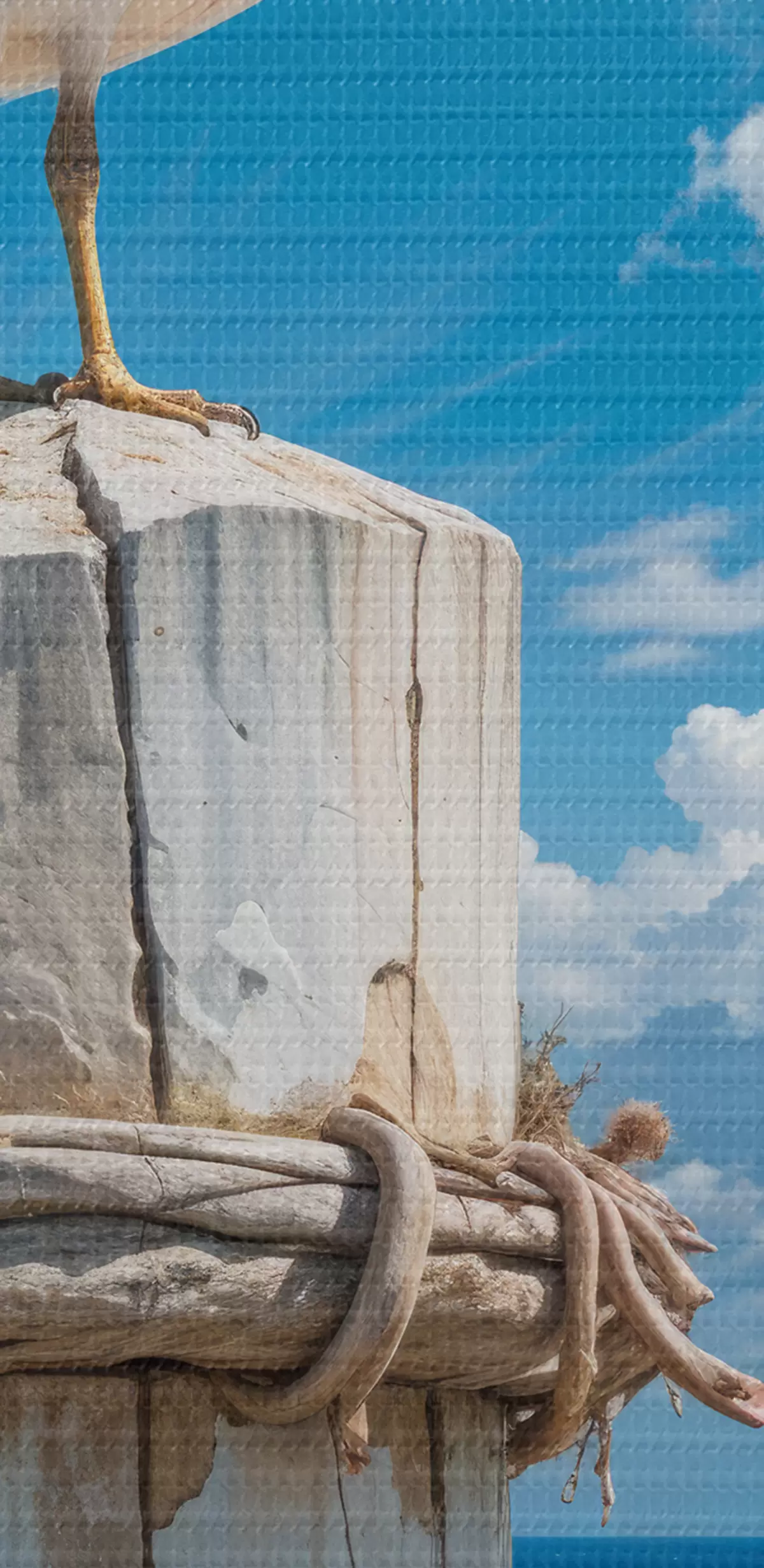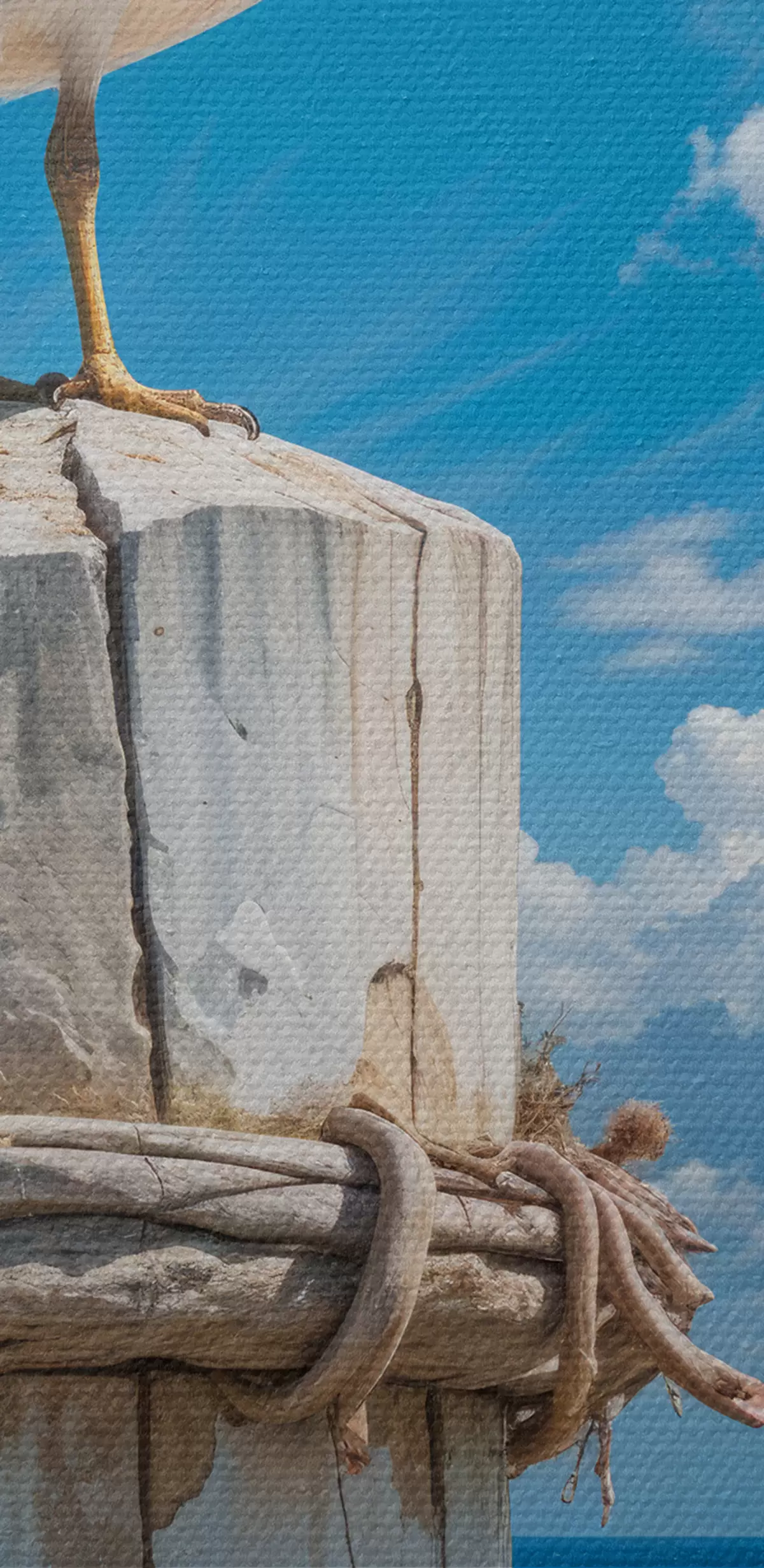 Vászonkép Egy fehér sirály egy faoszlopon ülve, fényes kék égbolt és hullámokkal teli óceán előtt Nr s40590
