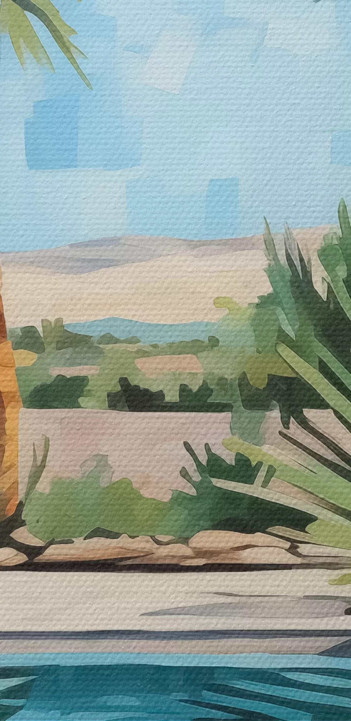 Vászonkép Pálmafák a szálloda közelében, medence a sziklák közelében, kék, zöld, piros színben Nr s40748