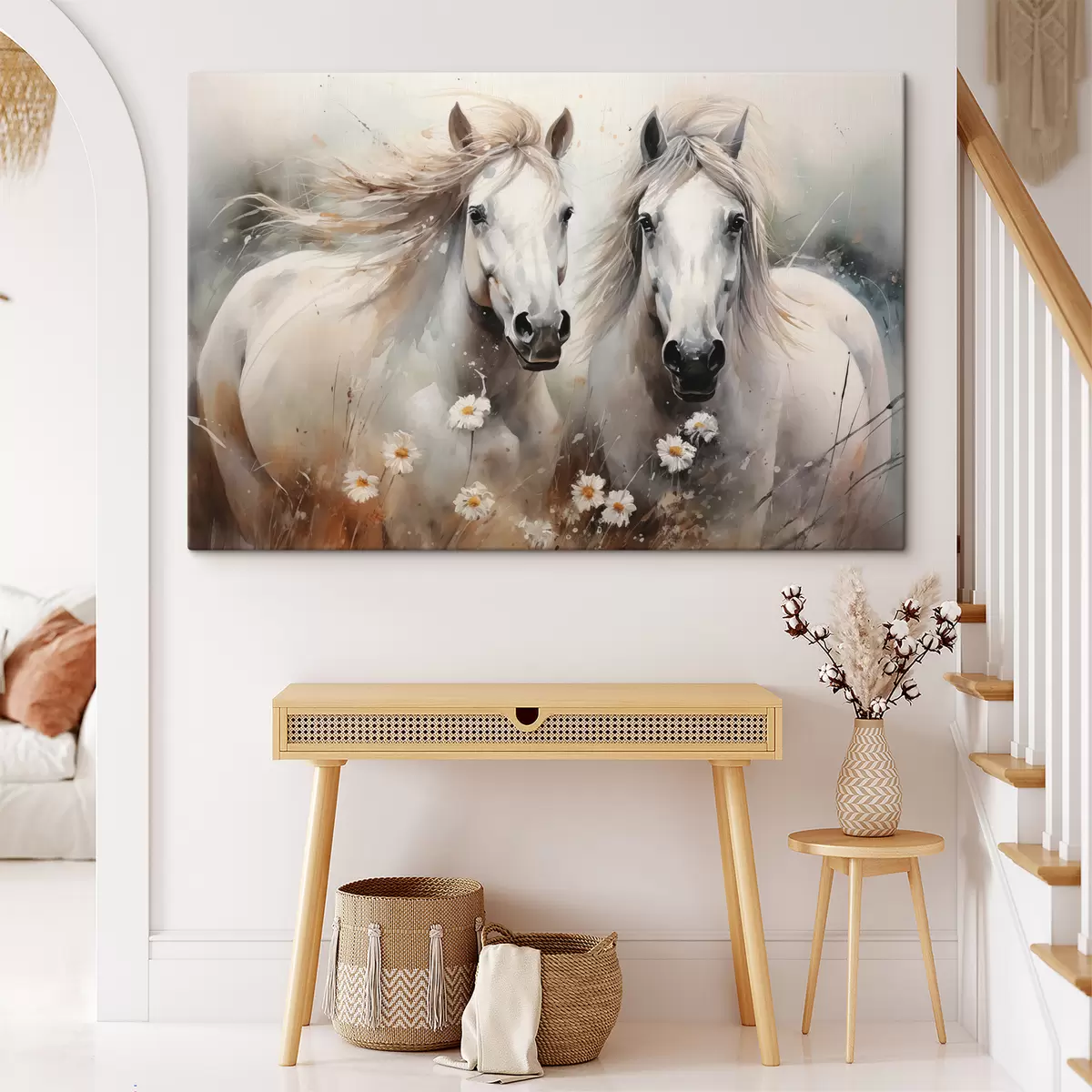 Vászonkép Egy pár fehér és szürke ló százszorszépek mellett Nr s40749