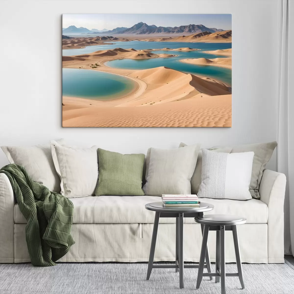 Vászonkép Hatalmas sivatagi táj, gördülő homokdűnékkel és türkizkék tavakkal, körülvéve zord hegyekkel Nr s41087