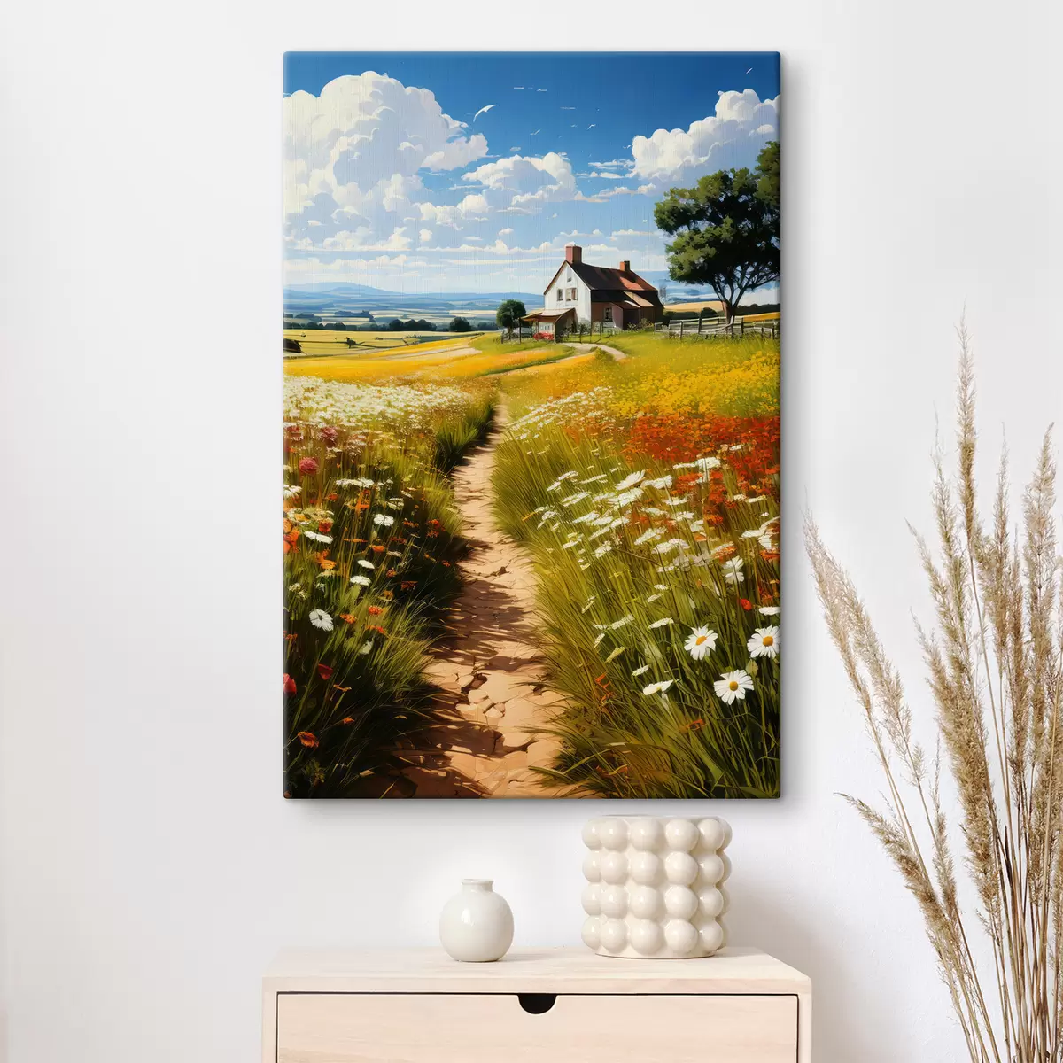 Vászonkép egy ösvény egy virágos mezőn és egy ház Nr s41109