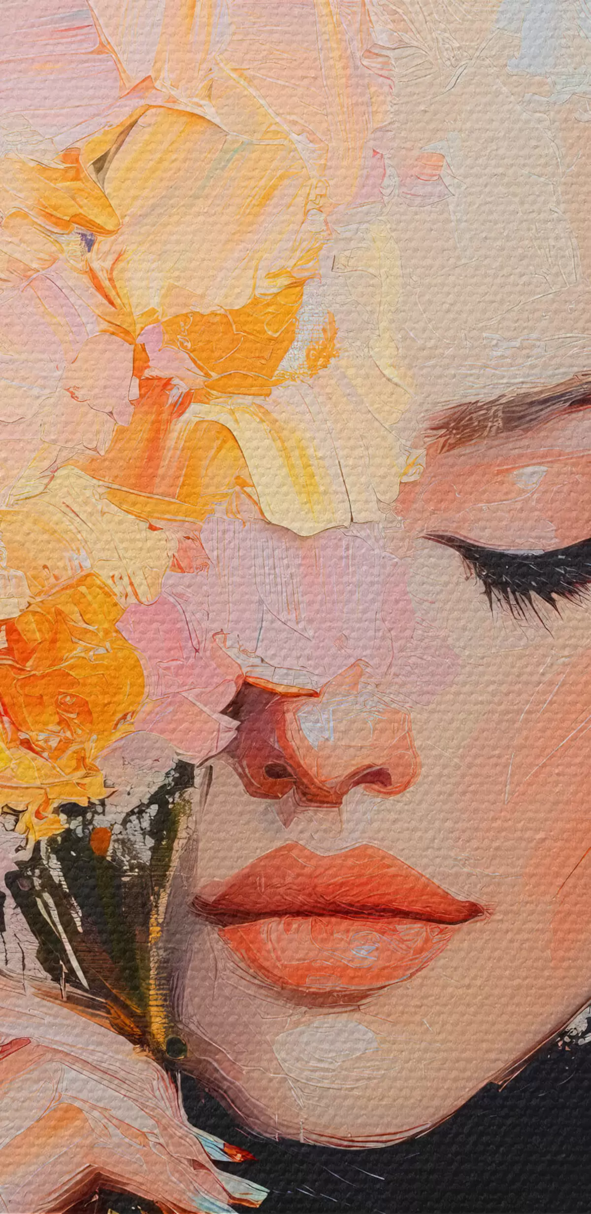 Vászonkép Absztrakt nő egy csokor virággal a kezében ecsetvonásokkal Nr s41355