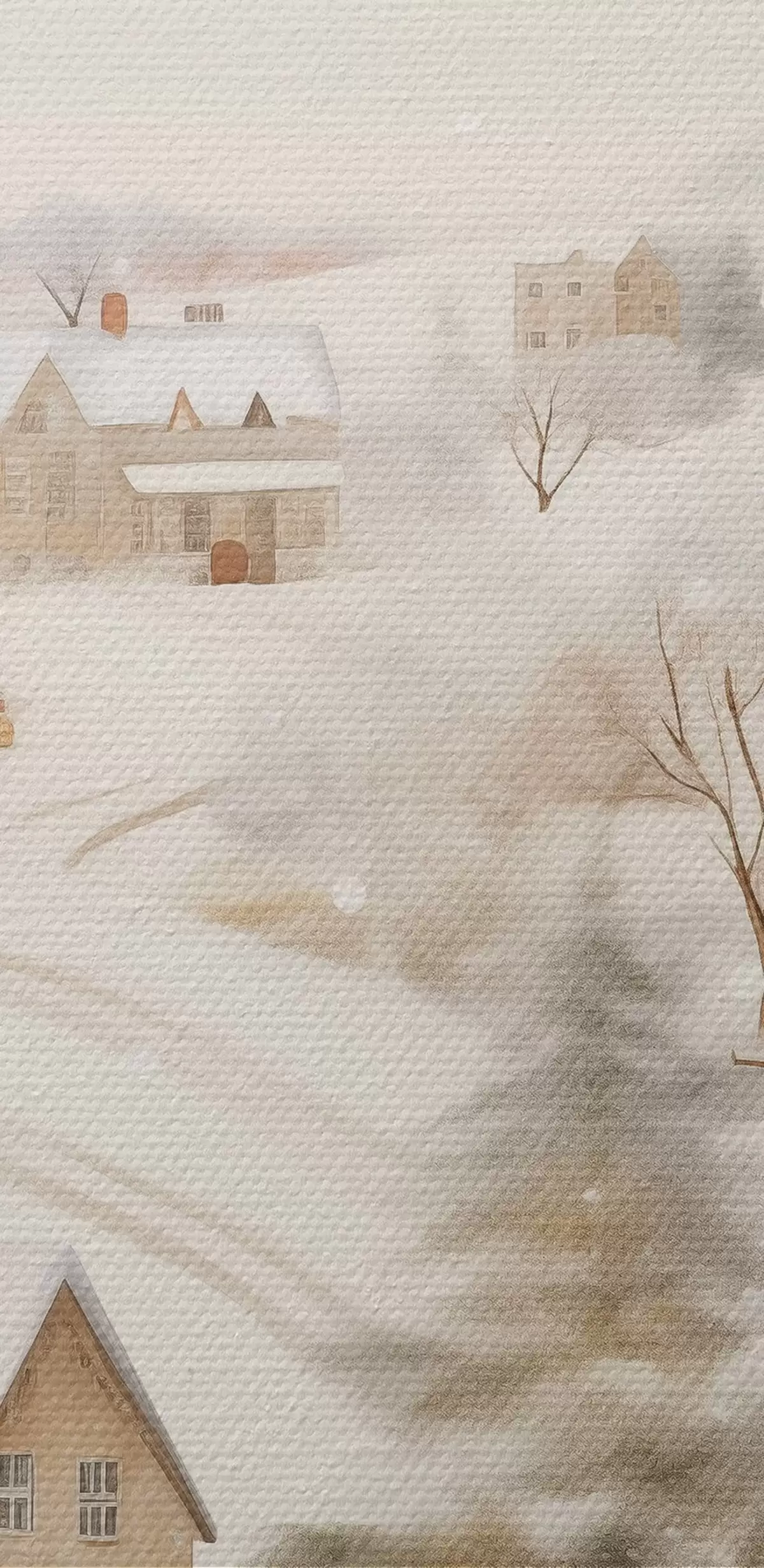 Vászonkép Téli falu, akvarell, hópelyhek, lágy színek, fák, táj, tájkép Nr s41381