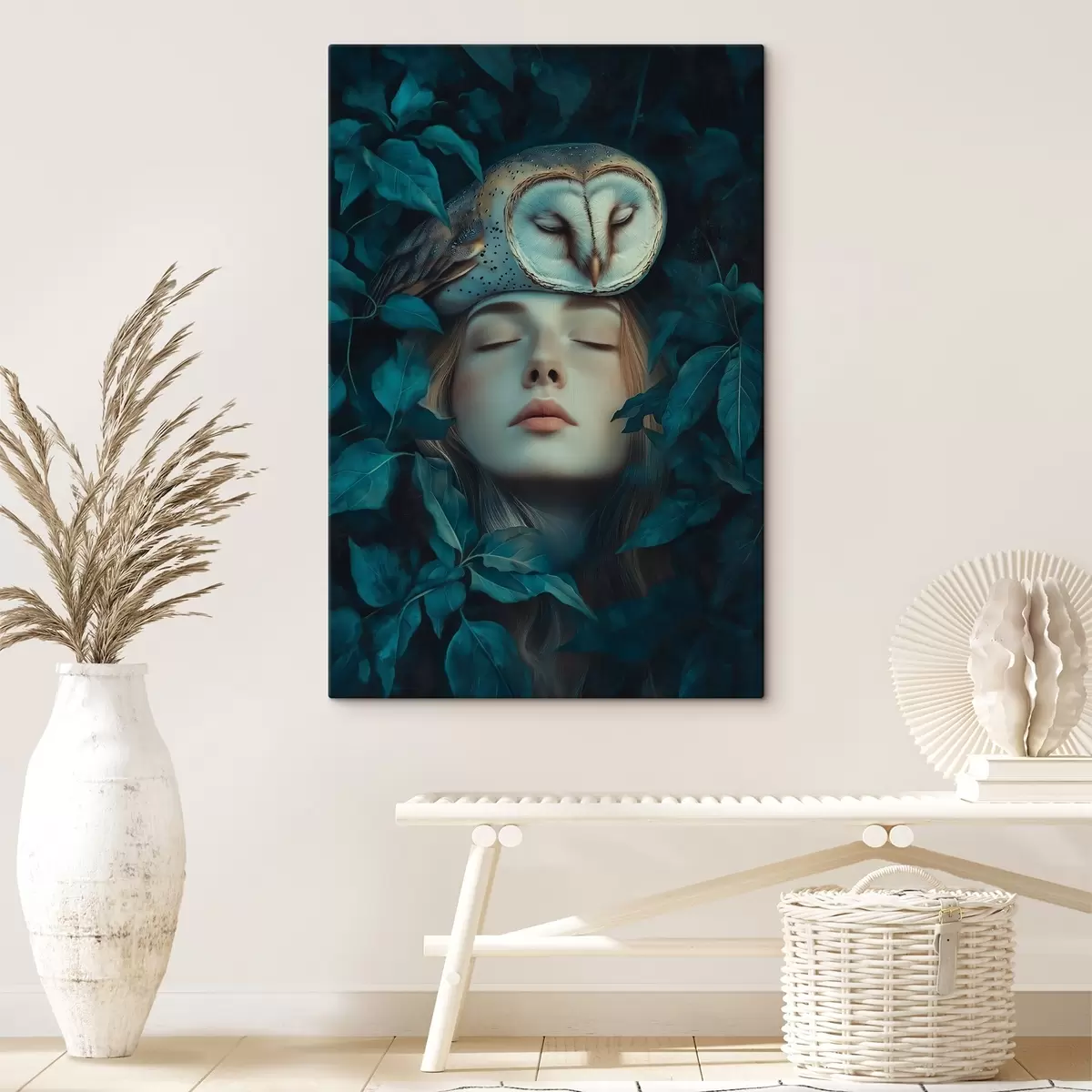 Vászonkép Nő bagollyal a zöld levelek között, békés, természet Nr s41445