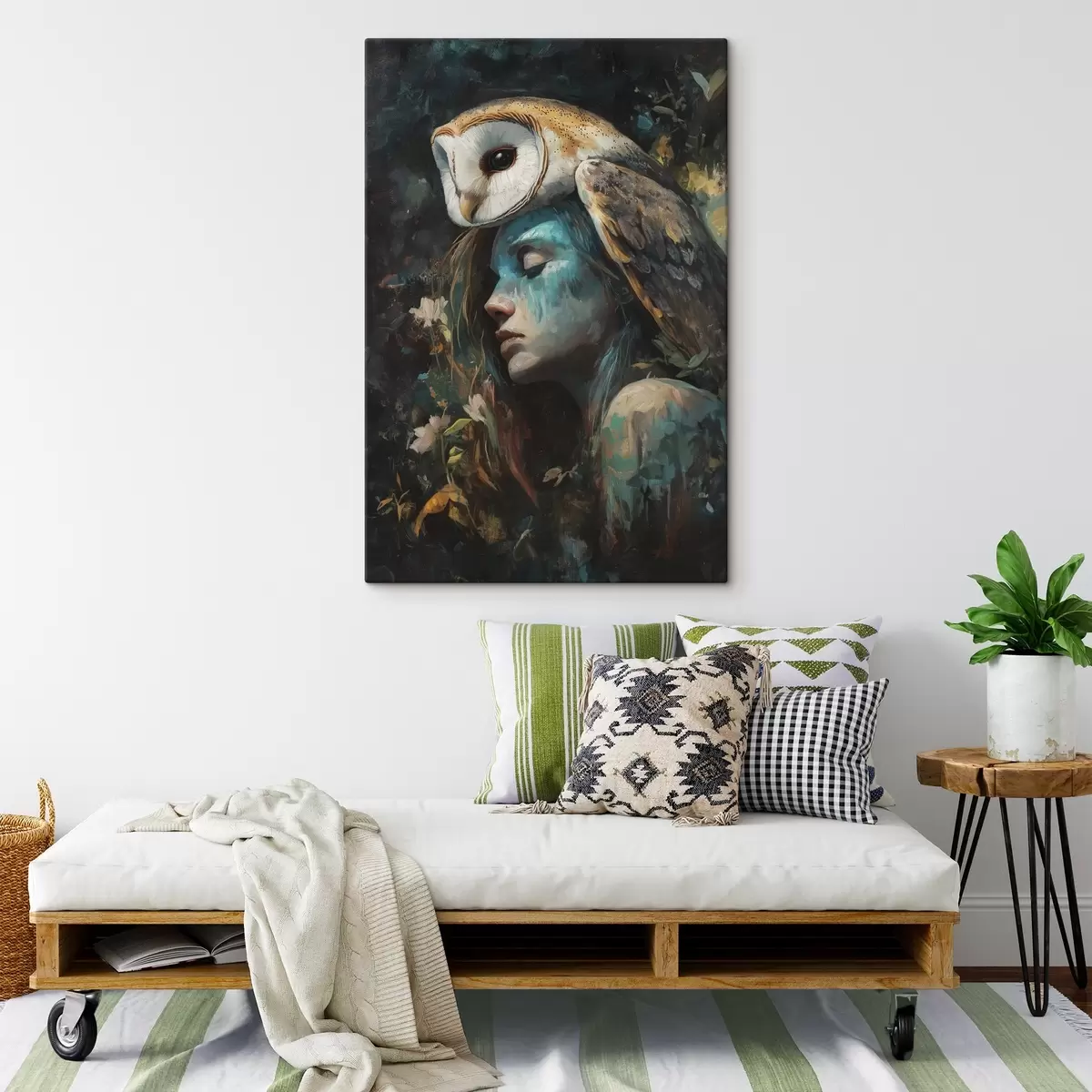 Vászonkép Olaj rajz, gyönyörű Bagoly fiatal nővel, virágos, virágos Nr s41446