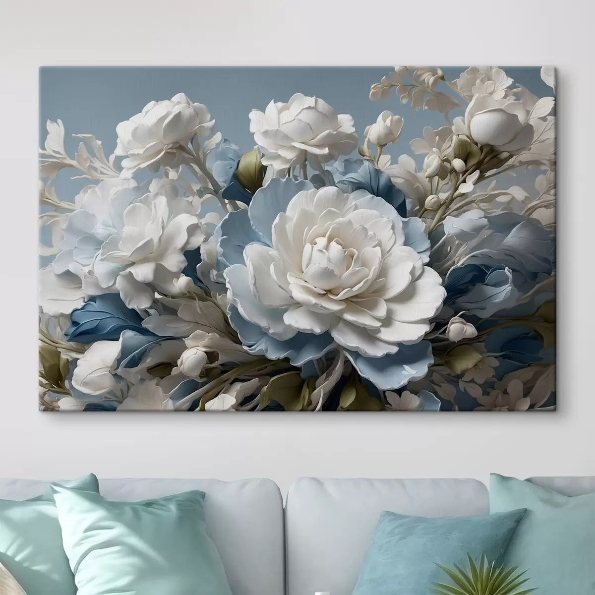 Vászonkép Fehér virágok és levelek kék háttéren Nr s41527