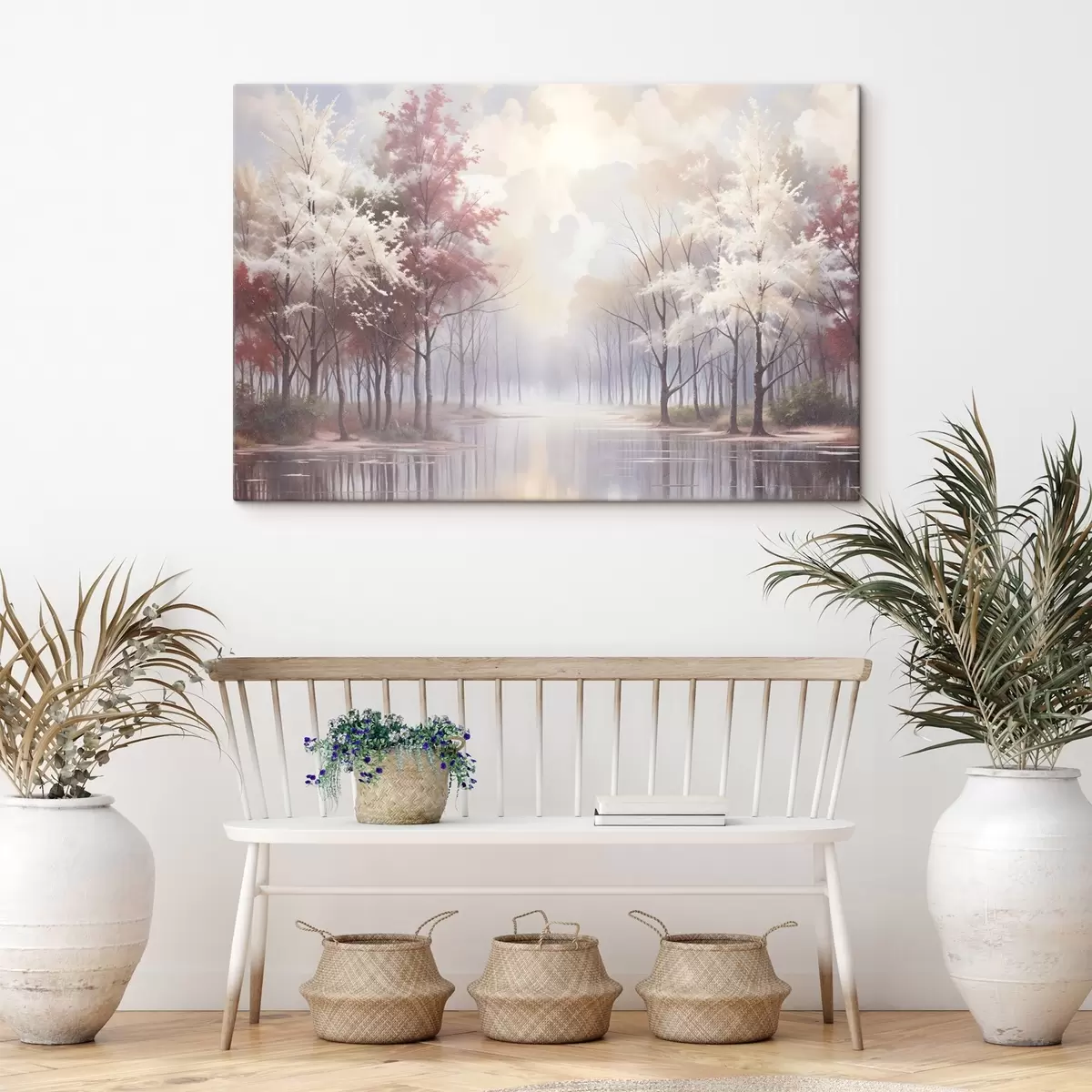 Vászonkép Egy nyugodt táj, ködös erdővel, csupasz fákkal és egy nyugodt tóval, amely a lágy rózsaszín és fehér tónusokat tükrözi Nr s41720