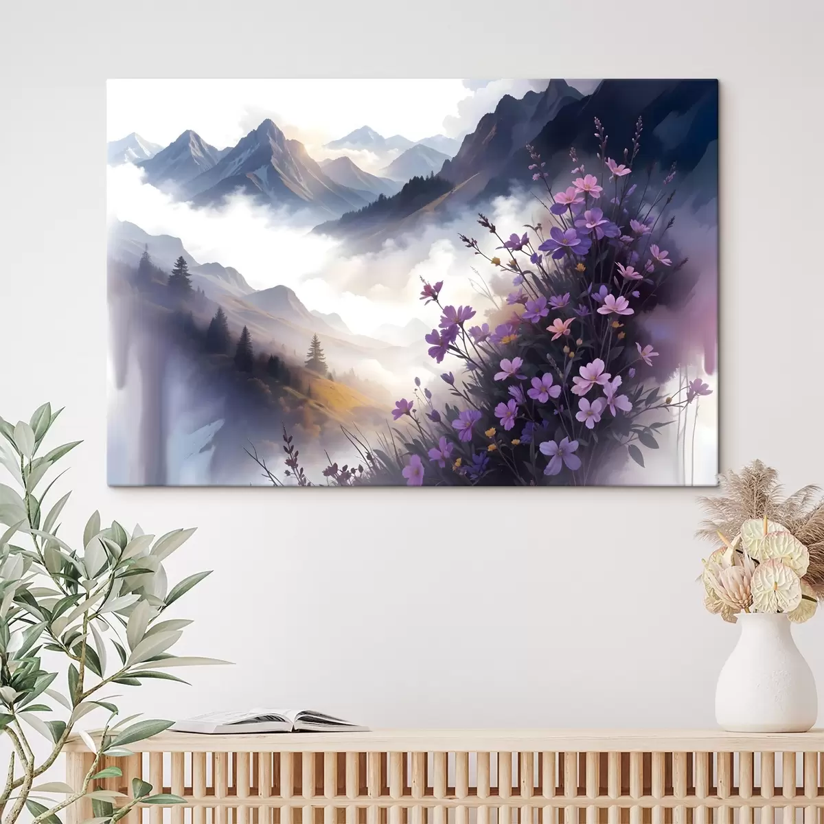 Vászonkép Tájkép, a háttérben hegyvonulat, az előtérben buja lila virágok körülvéve Nr s41724