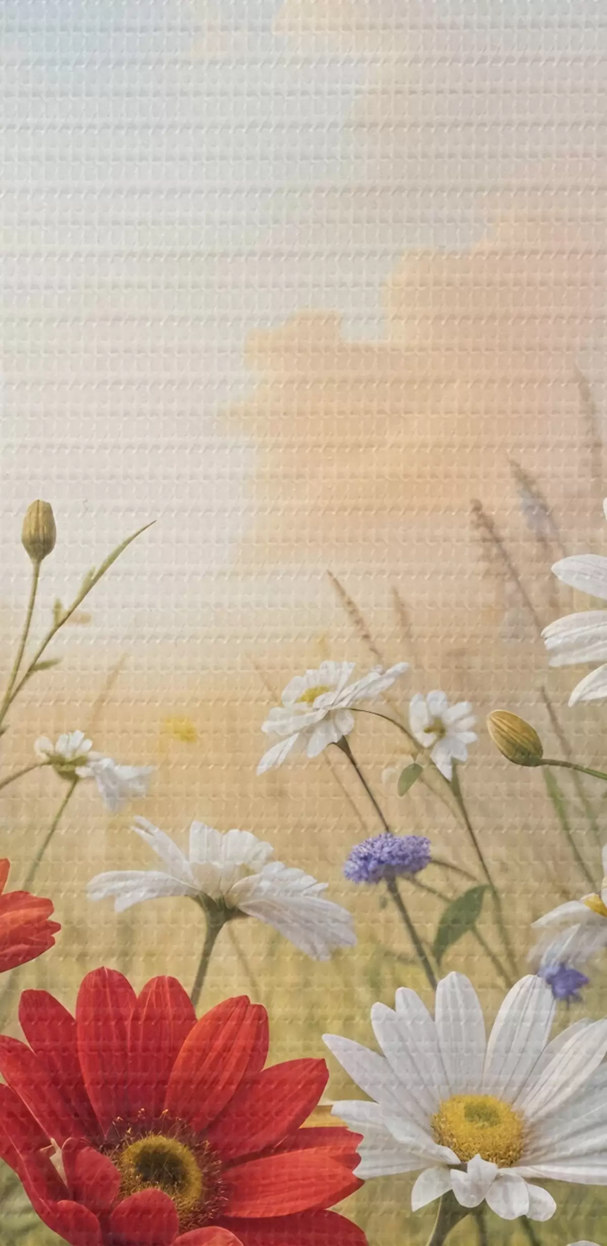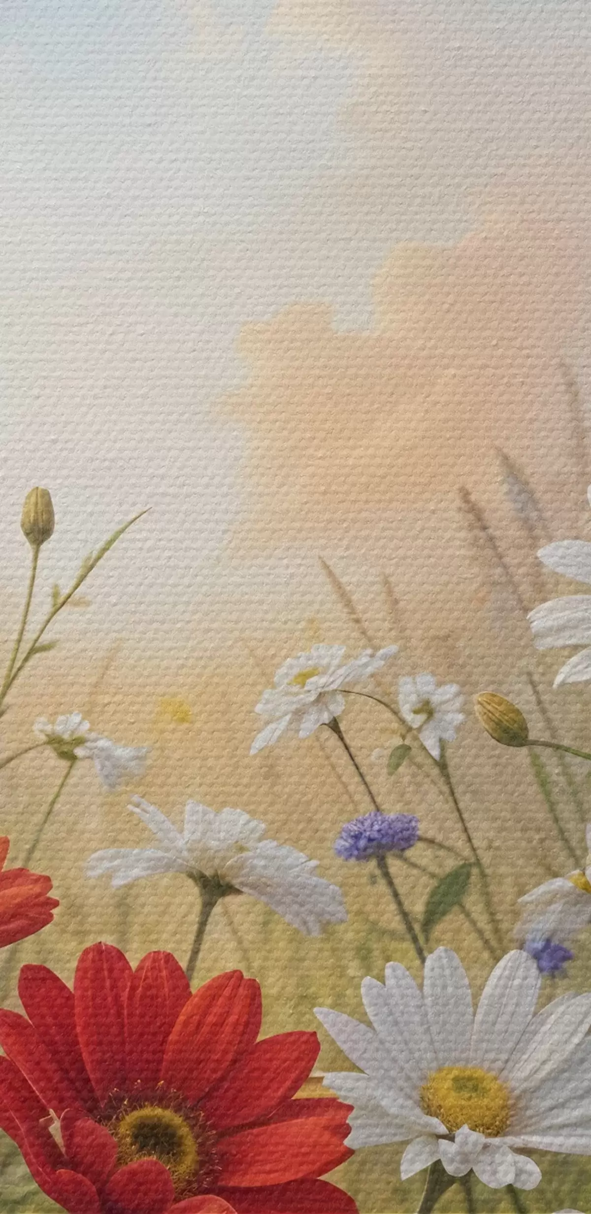 Vászonkép Színes vadvirágok, köztük százszorszépek, pipacsok és más virágzó növények mezője a kék égbolt előtt Nr s41725