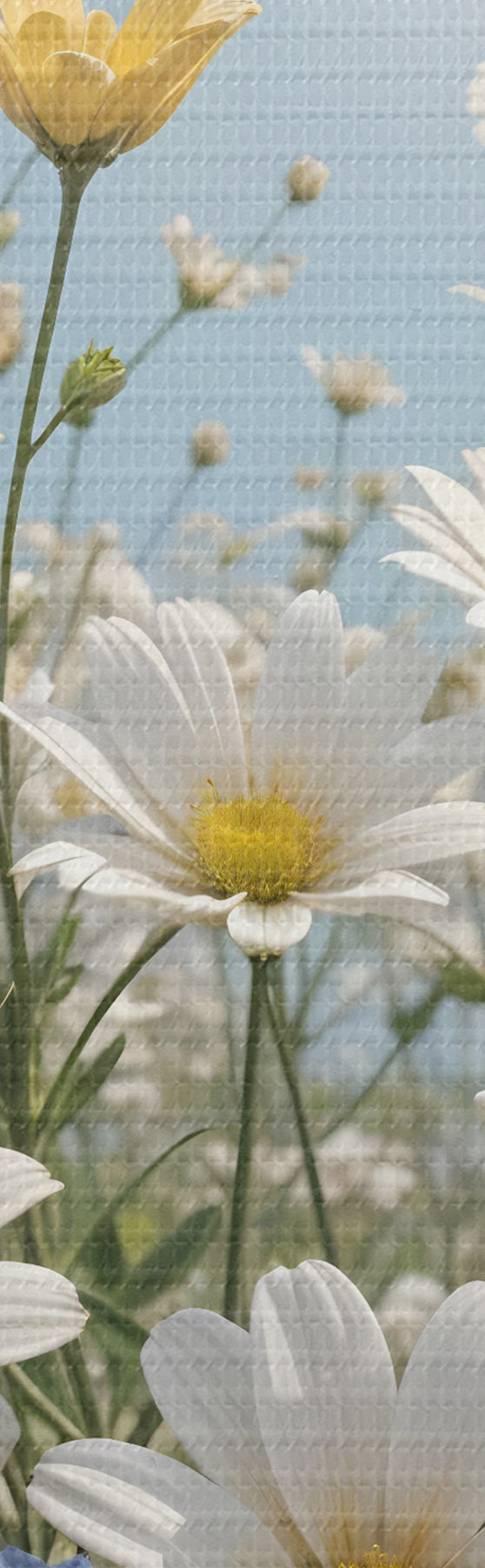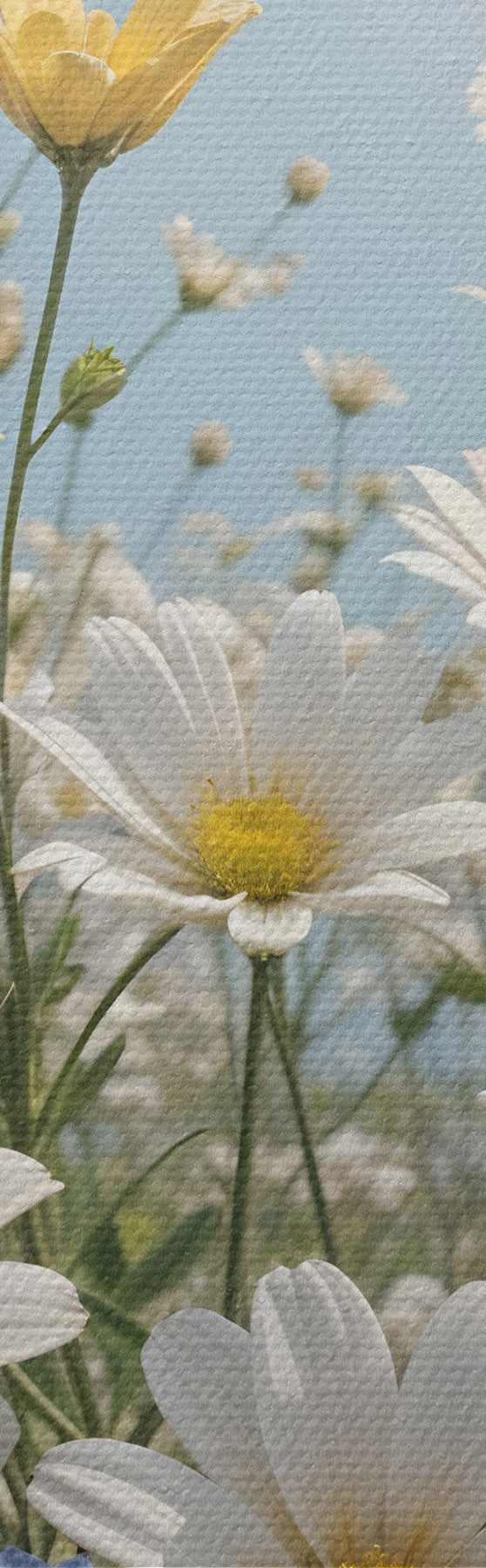 Vászonkép Fehér és sárga százszorszépek mezője kék égbolton, bolyhos fehér felhőkkel és fölöttük repülő pillangókkal Nr s41726