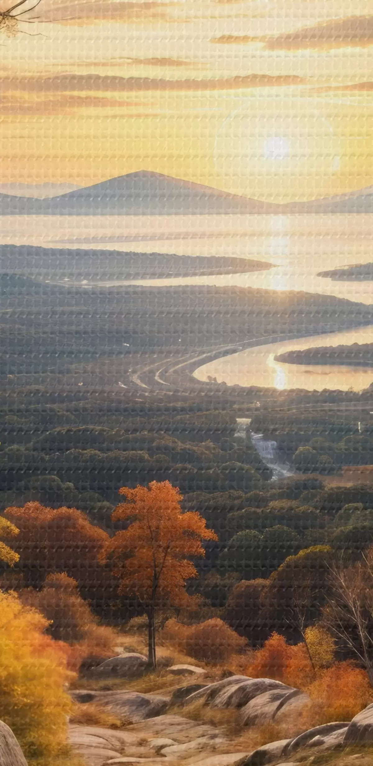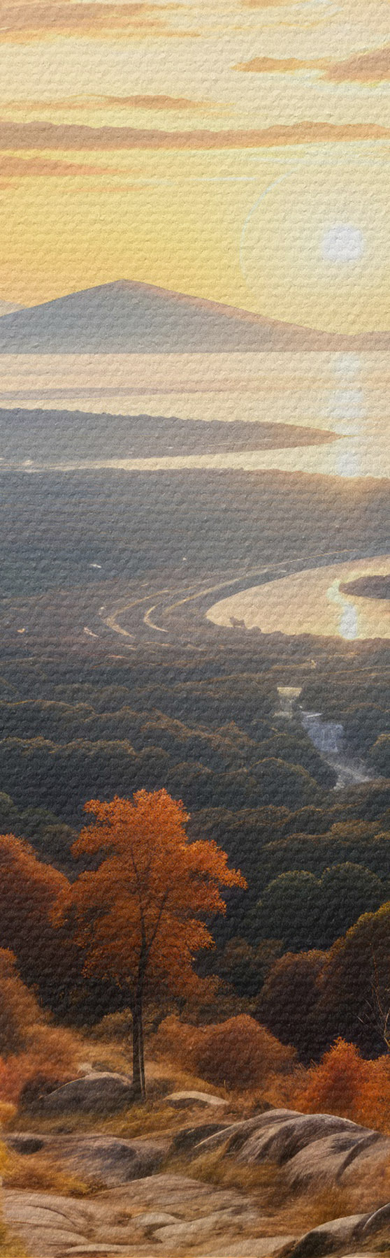 Vászonkép Tájkép egy kanyargós földúton, amely egy őszi színű fákból álló erdőn és a naplemente égboltján keresztül vezet Nr s41732