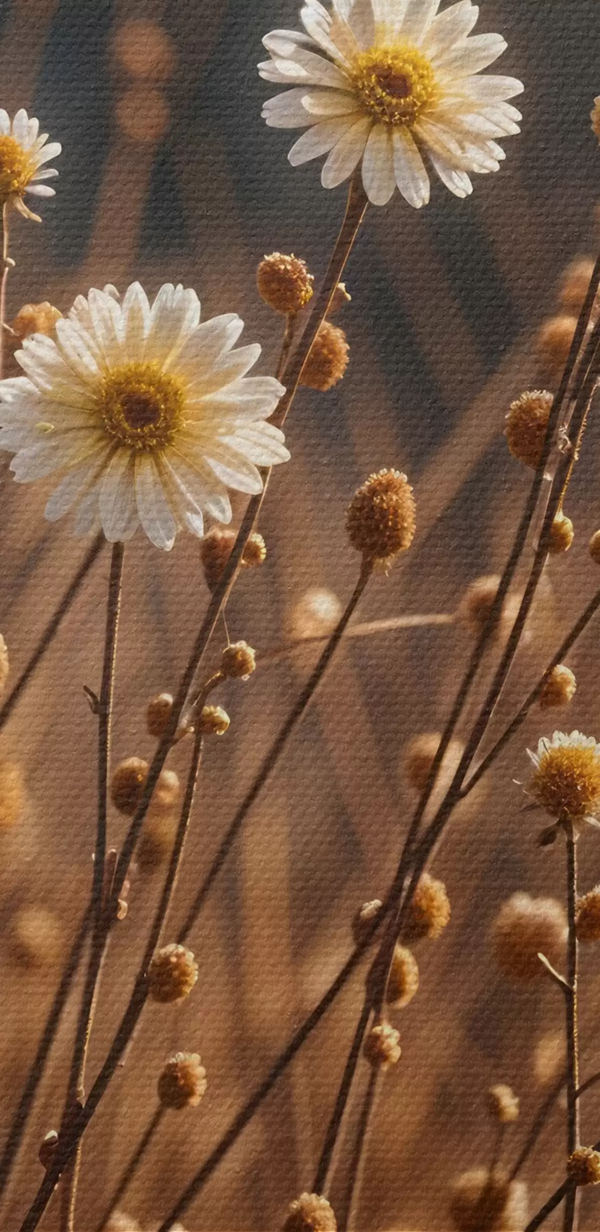 Vászonkép Fehér százszorszépek egy mezőben a száradt fű és szárak, meleg esti napfényben Nr s41735