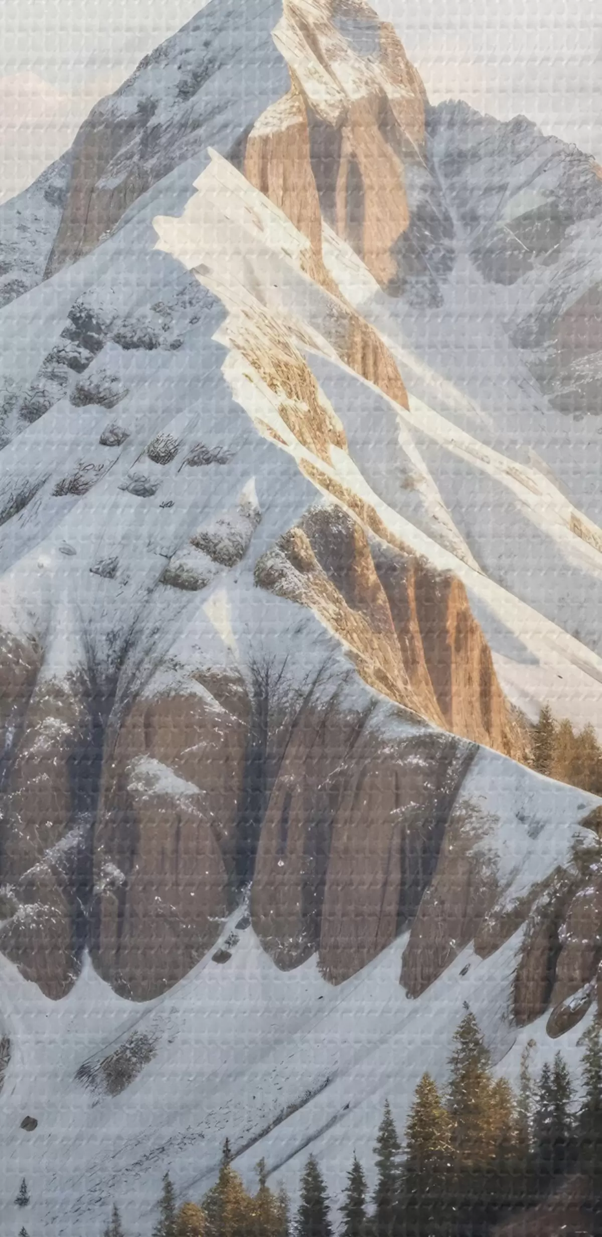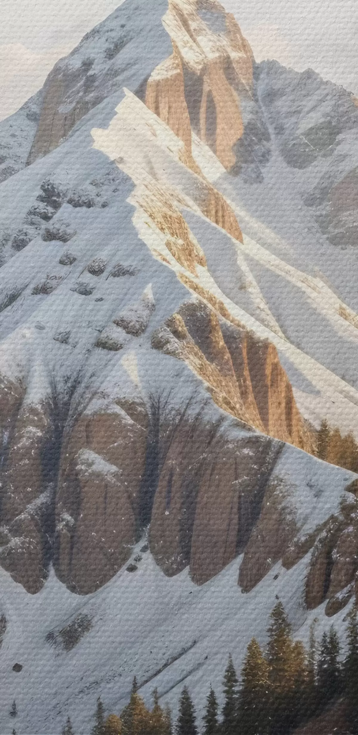 Vászonkép Egy hófödte hegycsúcs emelkedik egy erdős táj fölé, előtérben fenyőfákkal Nr s41736