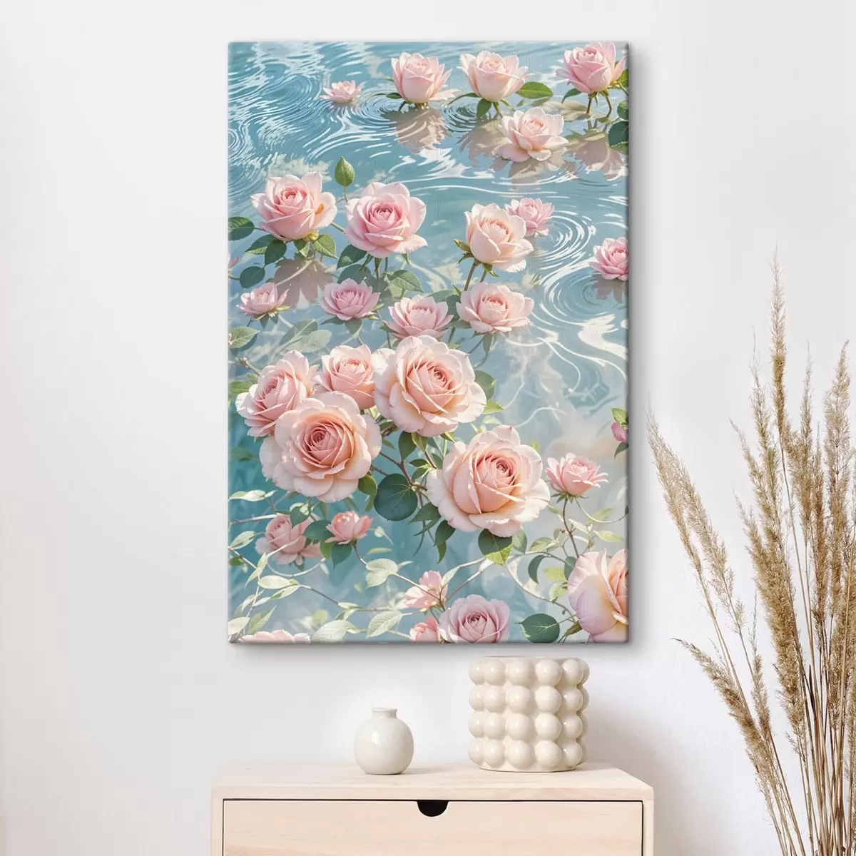 Vászonkép Finom rózsaszín rózsák lebegnek egy nyugodt tavon, fodrozódó vízzel, buja zölddel körülvéve Nr s41742