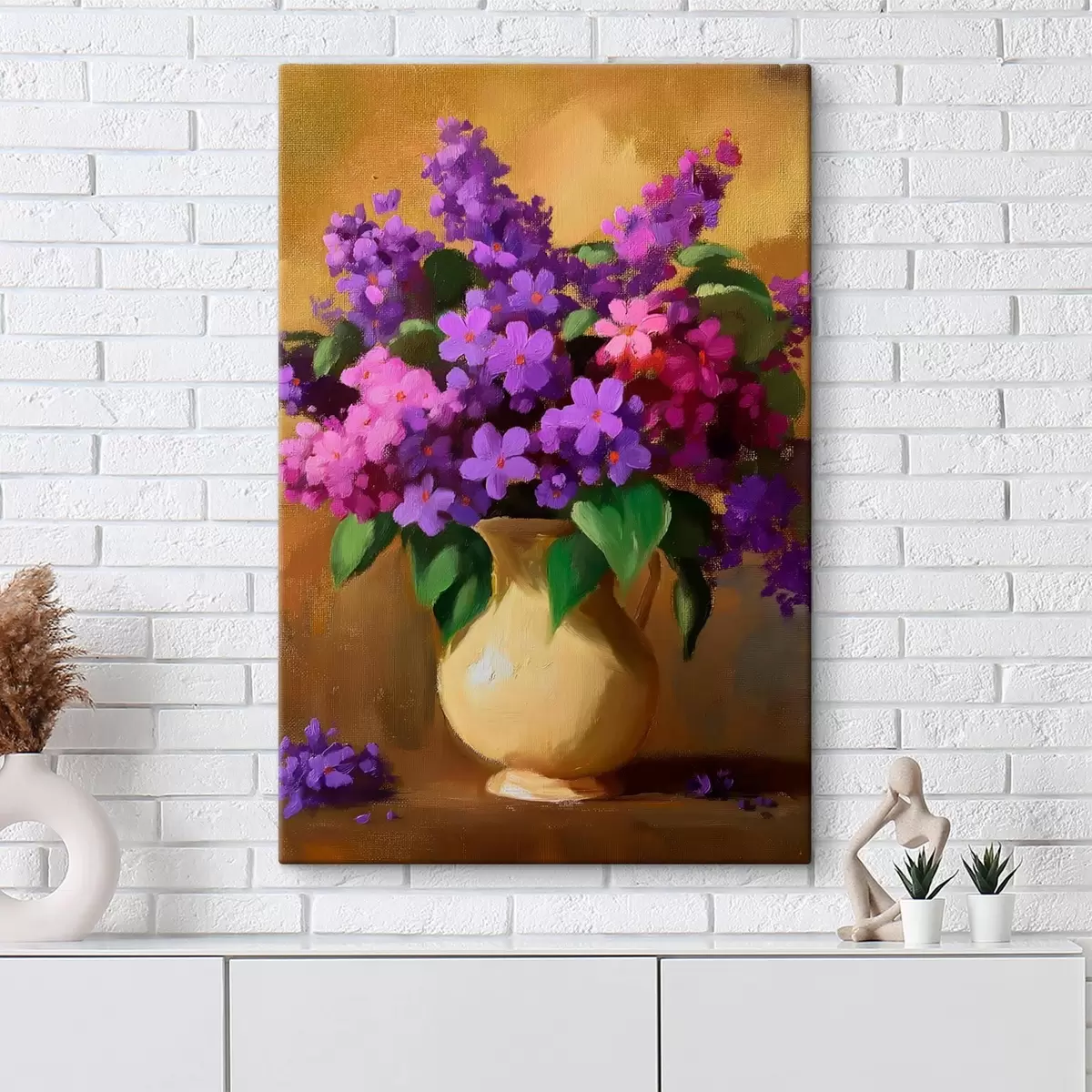 Vászonkép Lila-rózsaszín virágok sárga kancsóban Nr s41822