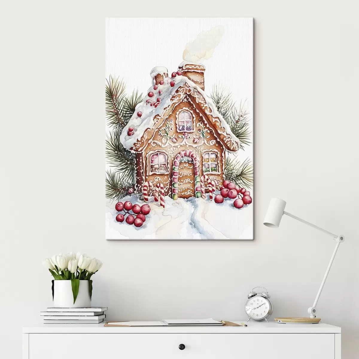 Vászonkép Mézeskalács házikó, fenyőfa ágak, piros bogyók, Karácsony Nr s41946