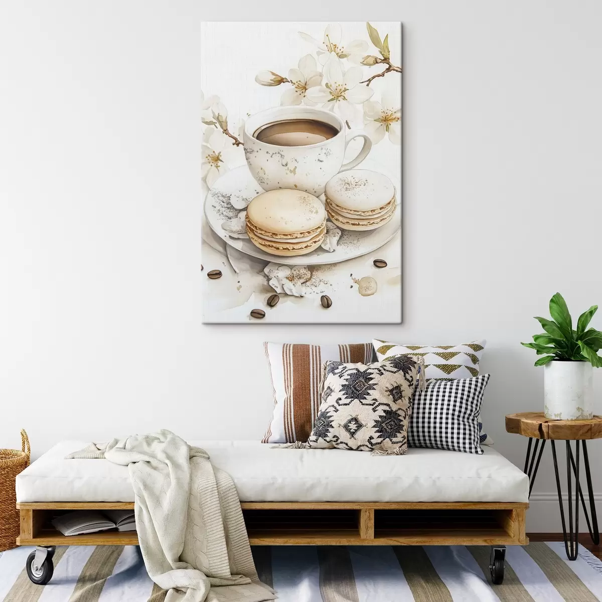 Vászonkép Egy csésze kávé macaronokkal, akvarell stílus, lágy színek, jázminvirágok Nr s41949