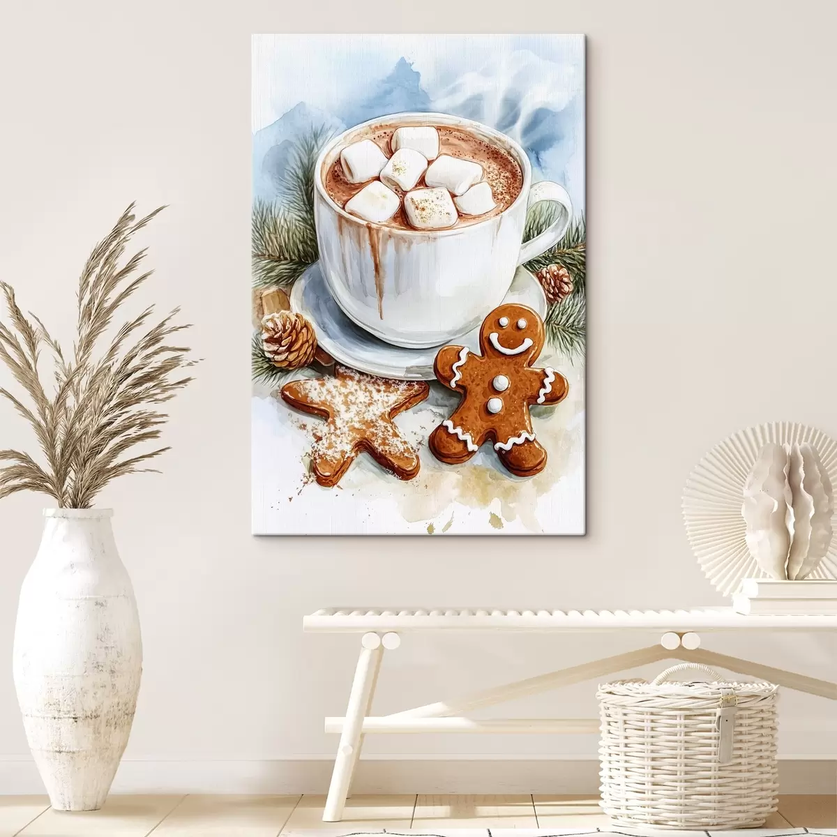 Vászonkép Egy csésze kakaó mályvacukorral, mézeskalácsemberek, sütemények, fenyőfák tobozokkal Nr s41952