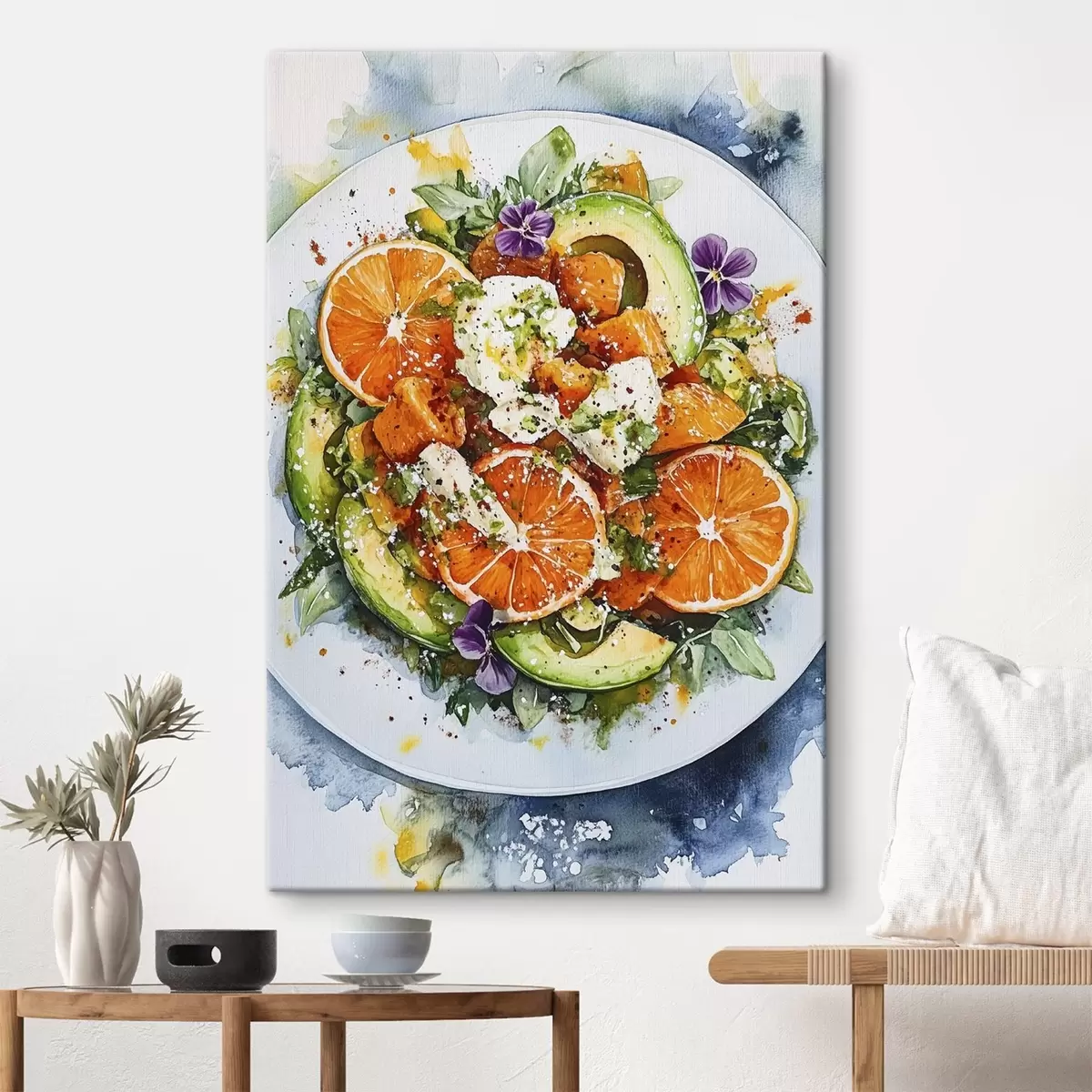 Vászonkép Finom saláta naranccsal, feta sajttal, sütőtökkel és avokádóval, akvarell ételek Nr s41959