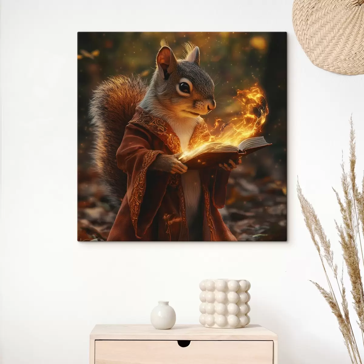 Vászonkép Egy misztikus mágus mókus varázslói köntösben, kezében egy mágikus kötetet tartva Nr s41983
