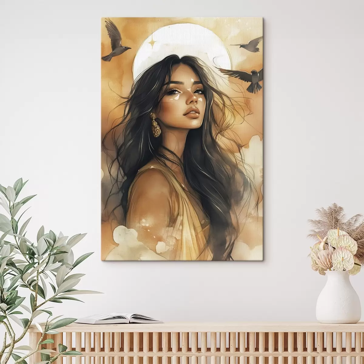 Vászonkép Nő repülő madarakkal, törzsi, bézs színek, nap Nr s42196