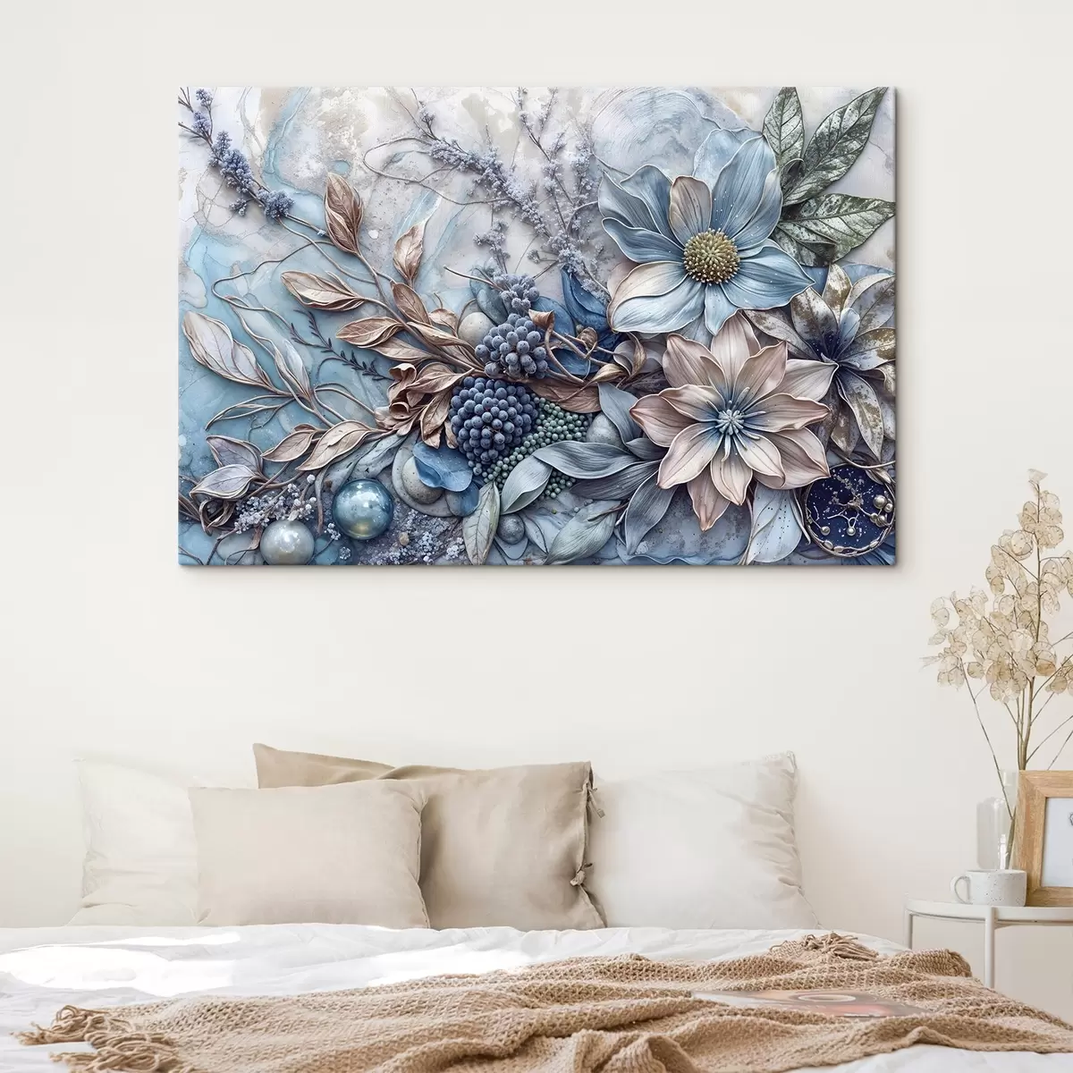 Vászonkép Részletes textúrájú, absztrakt, buja virágminták nagy, élénk kék és rózsaszín virágokkal, bogyókkal és egyéb botanikai elemekkel Nr s42210