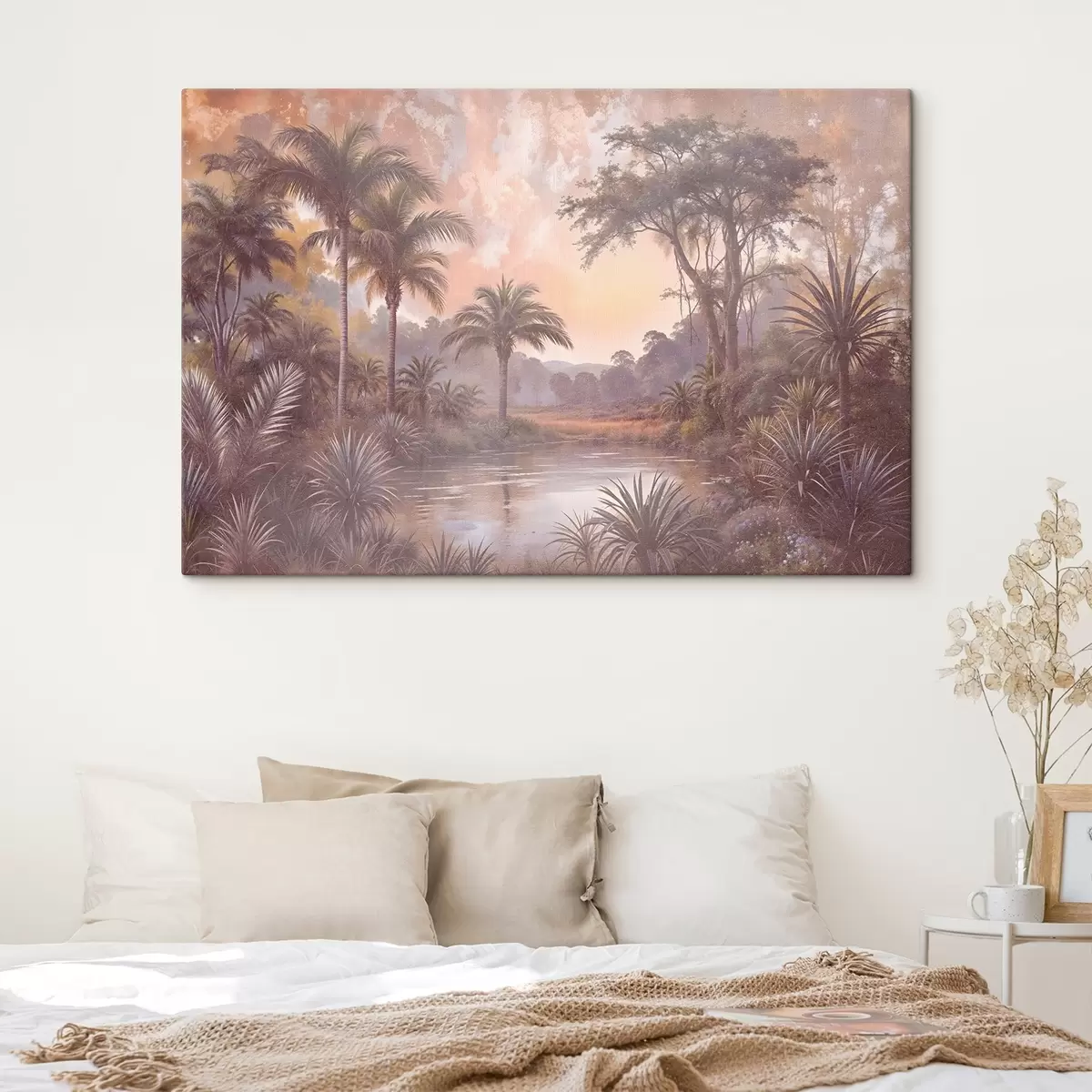 Vászonkép Trópusi textúrájú táj egy nyugodt tóval, amelyet buja pálmafák és más lombok vesznek körül Nr s42219