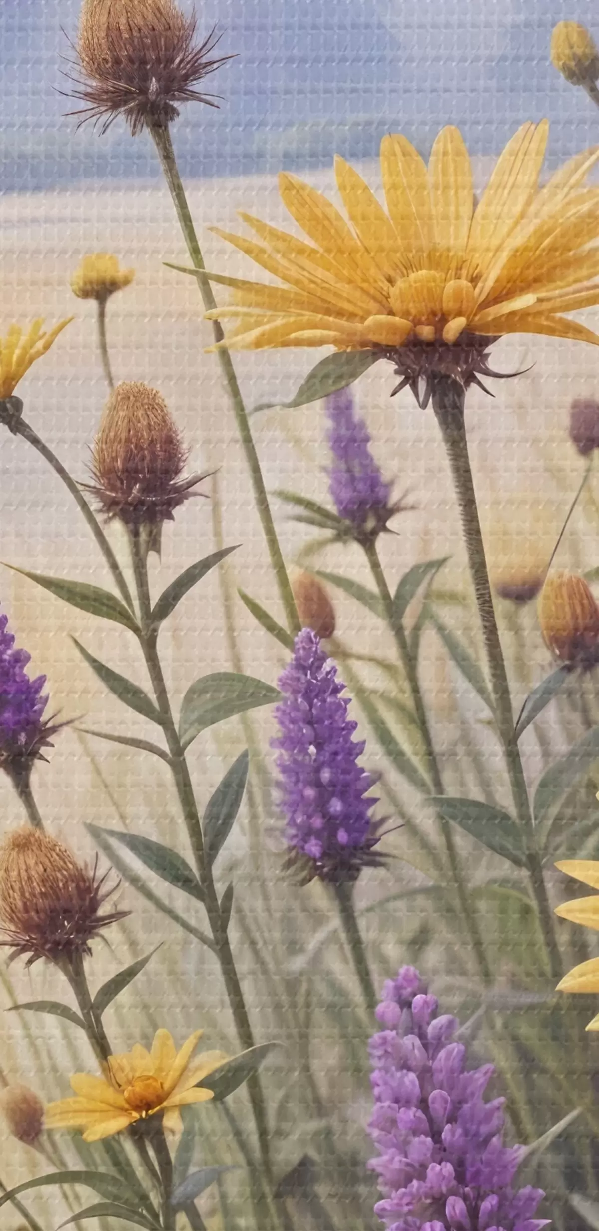 Vászonkép Sárga napraforgók és lila vadvirágok mezője egy ködös erdei tájban, a háttérben fenyőfákkal Nr s42223
