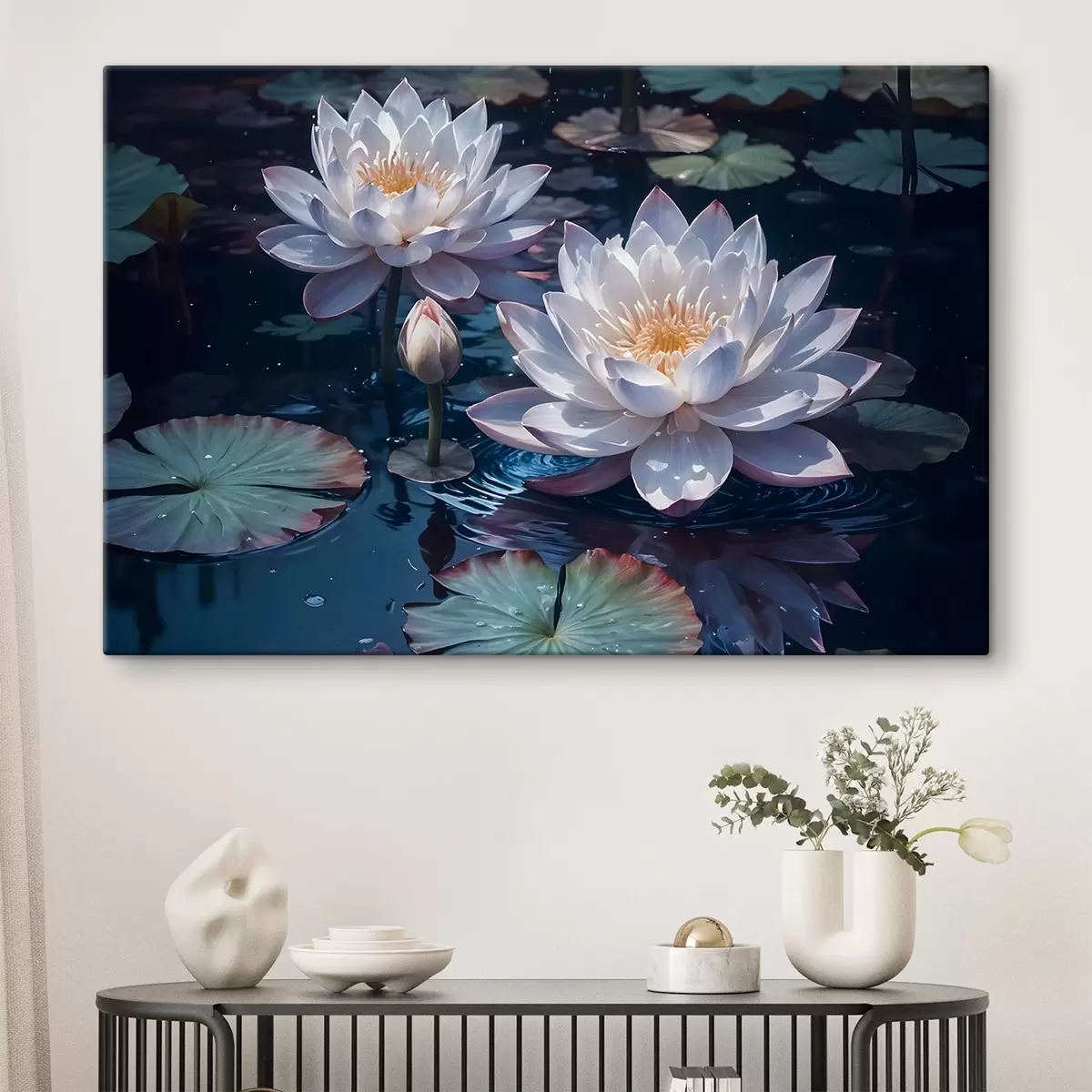 Vászonkép Fehér lótuszvirágok lebegnek egy nyugodt tavon, liliompárnákkal Nr s42225