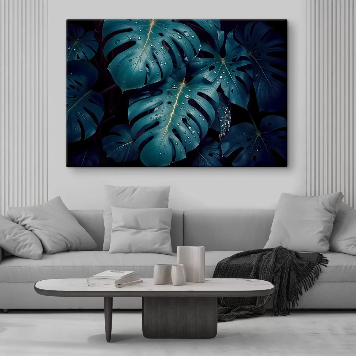 Vászonkép Buja trópusi monstera levelek vízcseppekkel sötét háttér előtt , ami egy hangulatos és atmoszférikus nyomatot hoz létre Nr s42233