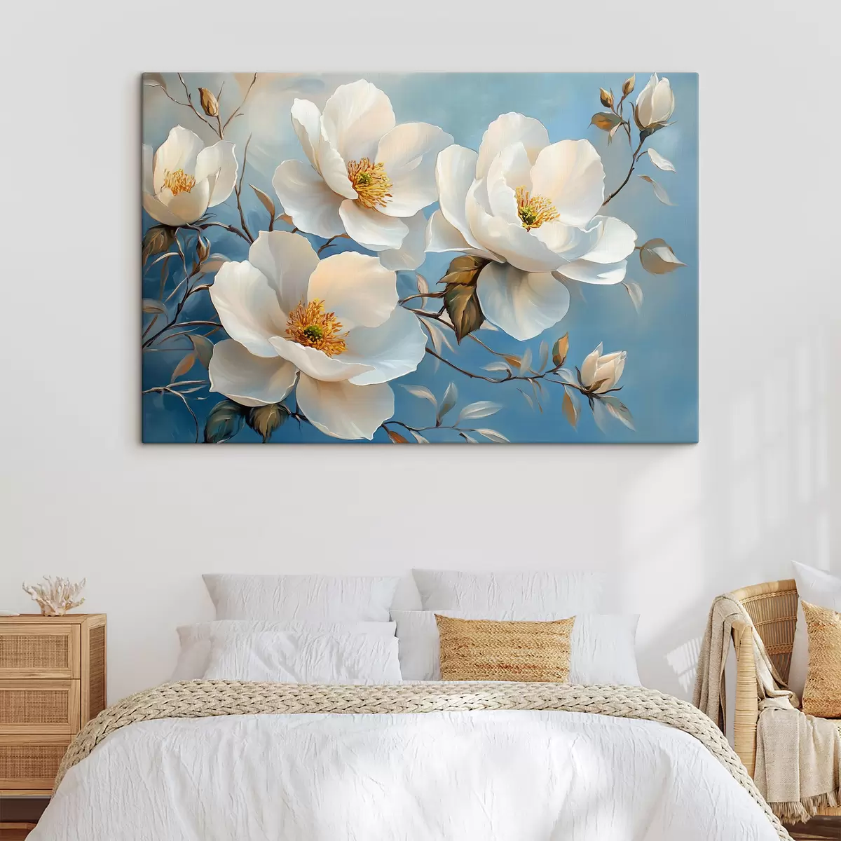 Vászonkép Nagy fehér virágok kék háttéren Nr s42321