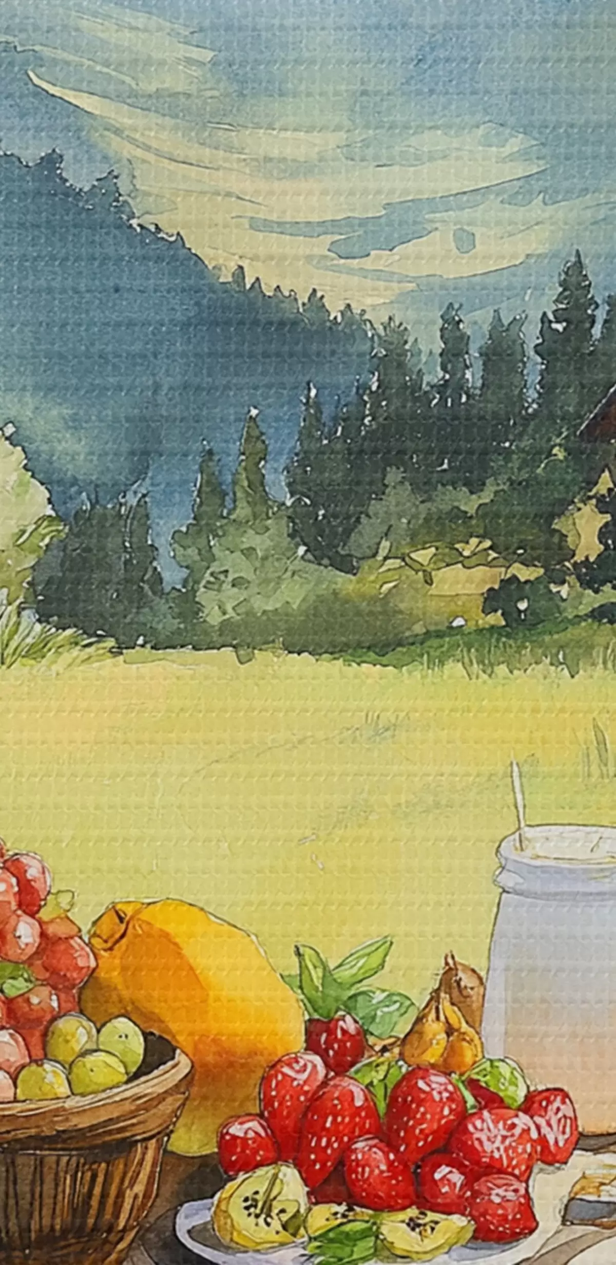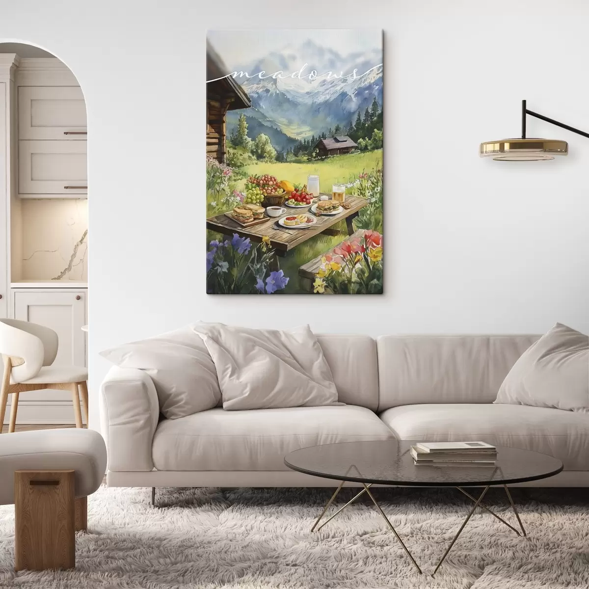 Vászonkép Hegyvidéki tájak, nyári rét, faházak, reggeli Nr s42425
