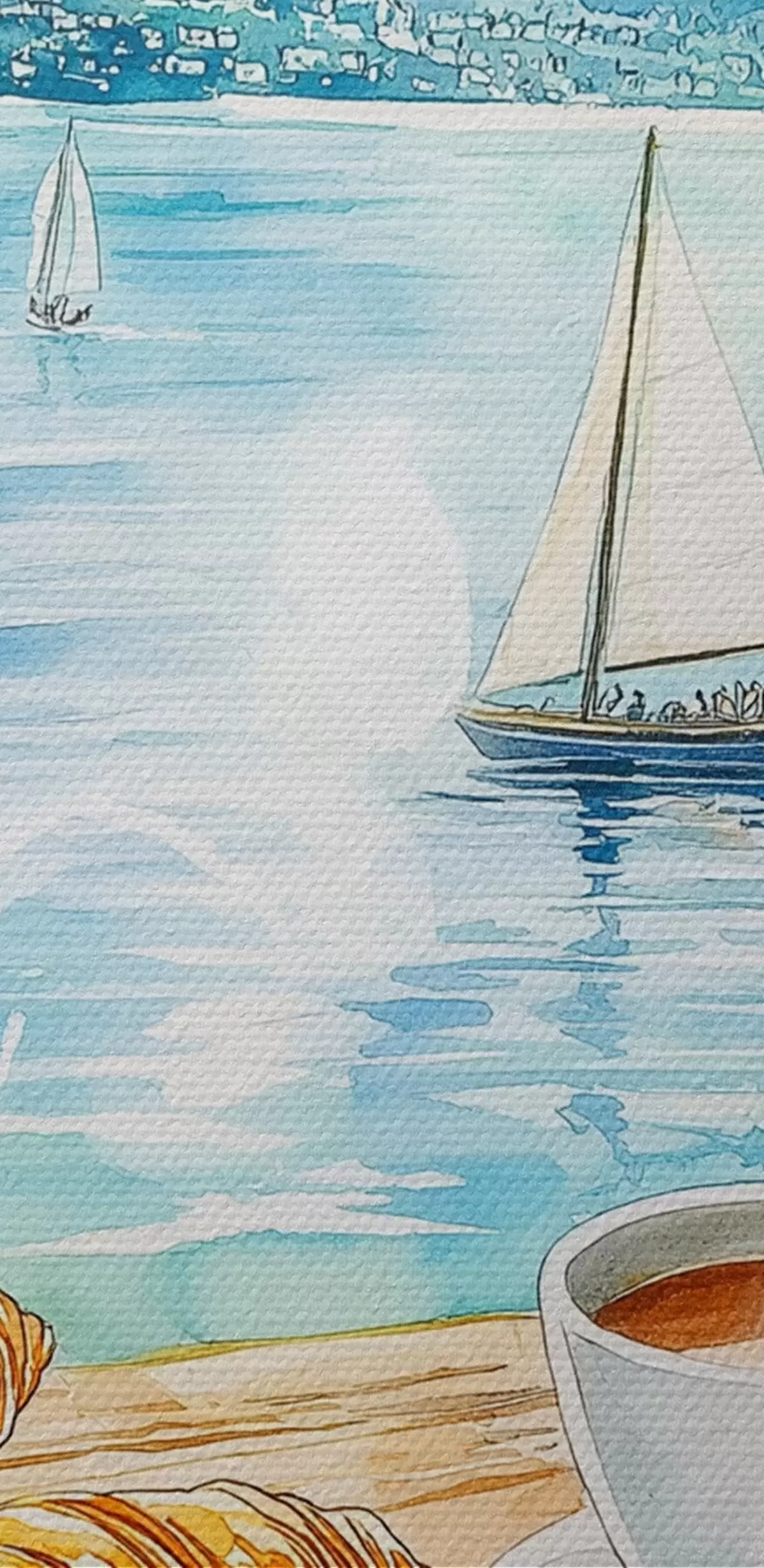 Vászonkép Nyári tó vitorlásokkal, kávéscsészékkel, croissantokkal, akvarell stílusban Nr s42441