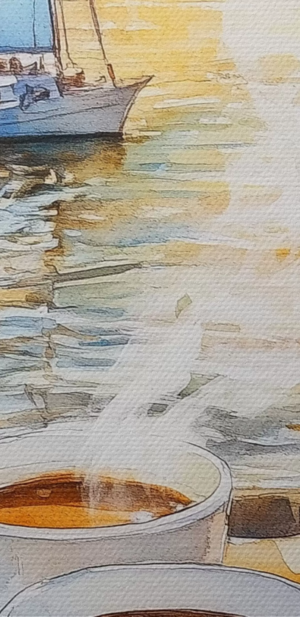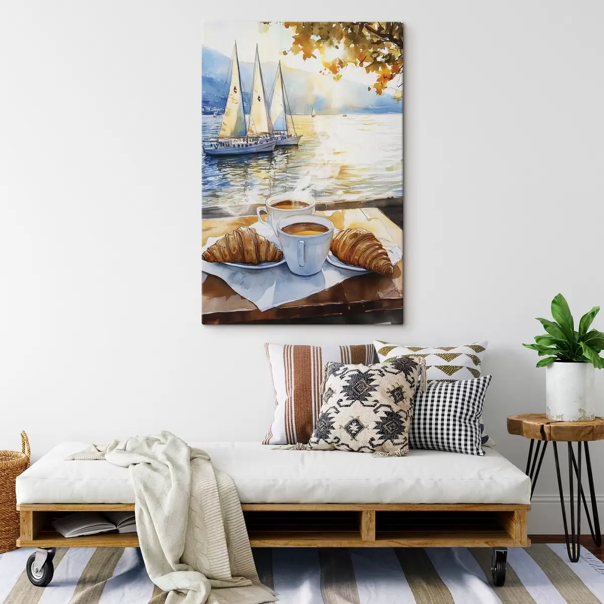 Vászonkép Csésze kávé, naplemente színek, tó, vitorlások, természet, utazás Nr s42443