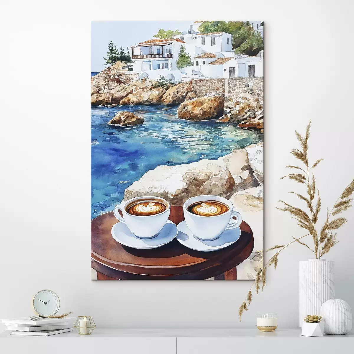 Vászonkép Akvarell tengerparti csésze kávéval, nyár Nr s42449