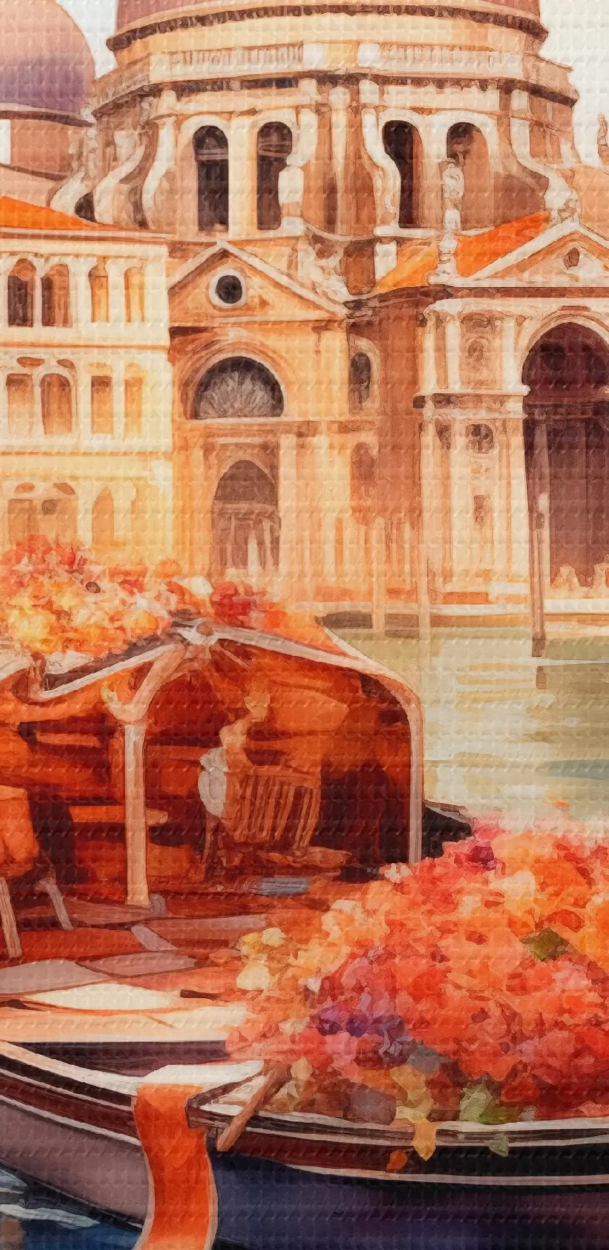 Vászonkép Őszi látkép Velencéről egy gondolával, amelyet élénk narancssárga és vörös levelek vesznek körül, a nyugodt csatornavízben tükröződő épületekkel. Nr s42576