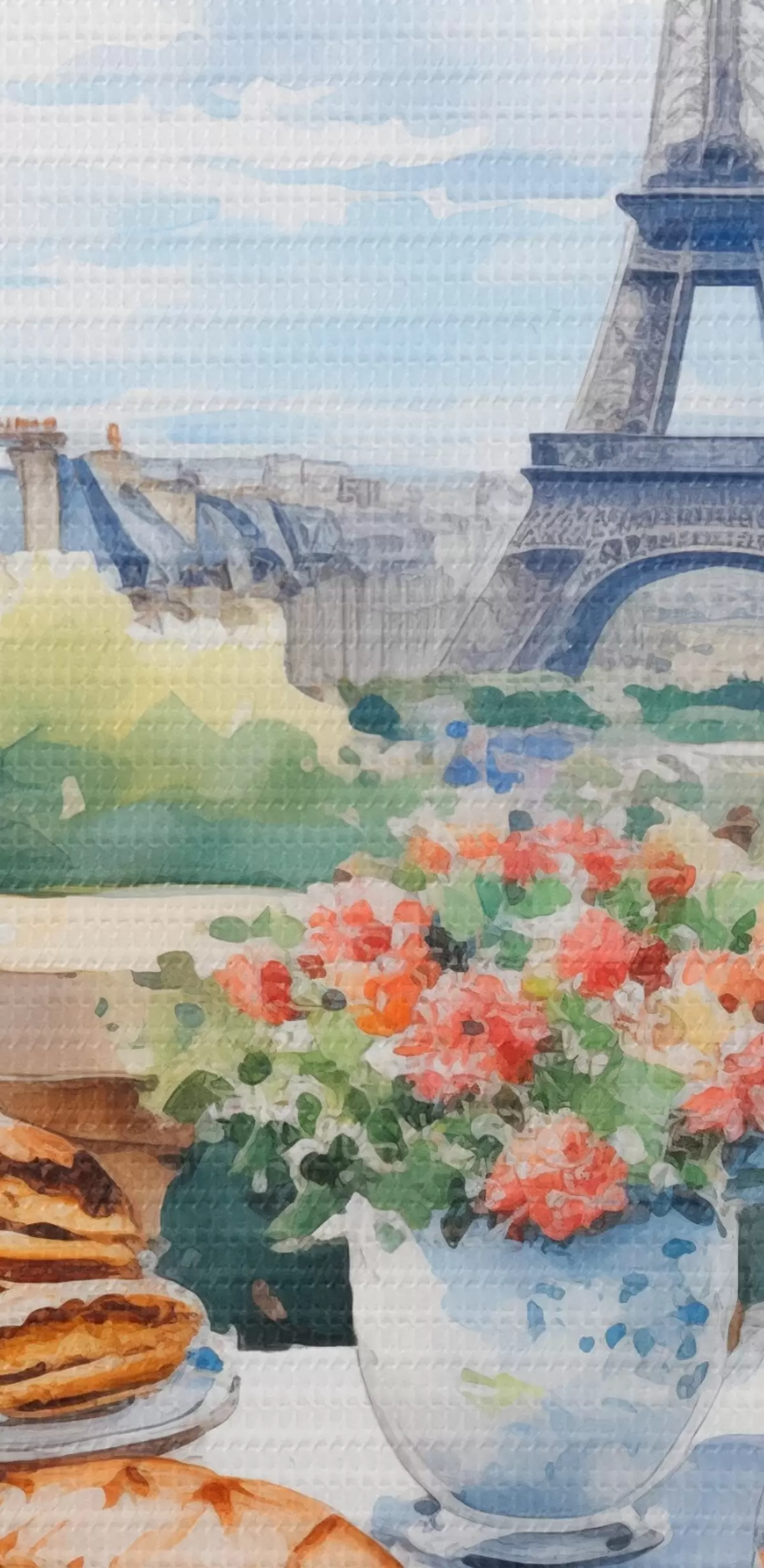 Vászonkép Romantikus kilátás az Eiffel-toronyra egy erkélyről, egy desszertekkel, teával és virágokkal megterített asztallal, nyárias hangulatban. Nr s42579