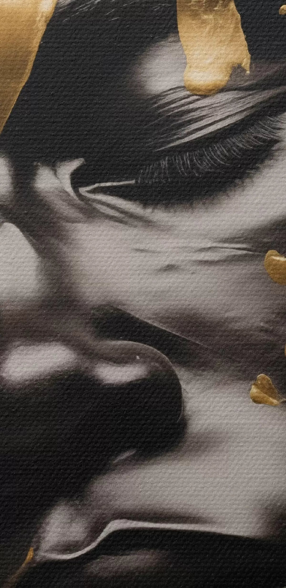 Vászonkép Egy férfi absztrakt portréja sima fekete-fehér tónusokban, amelyet élénk, meleg színű ecsetvonások emelnek ki, amelyek dinamikus hatást keltenek. Nr s42623