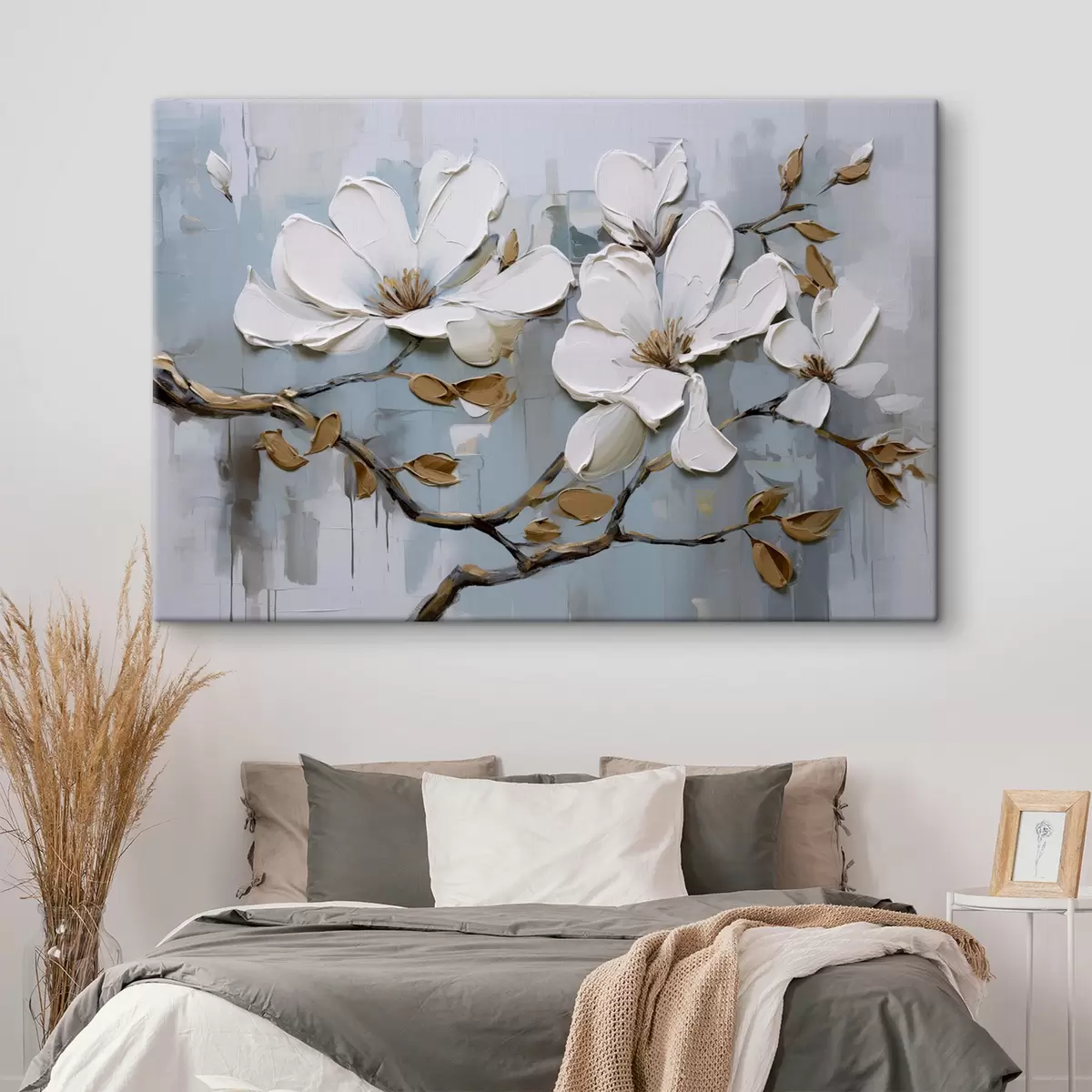 Vászonkép Fehér magnólia virágok texturált szirmokkal és barna levelekkel lágy kék háttéren olajfestmény utánzat Nr s42711