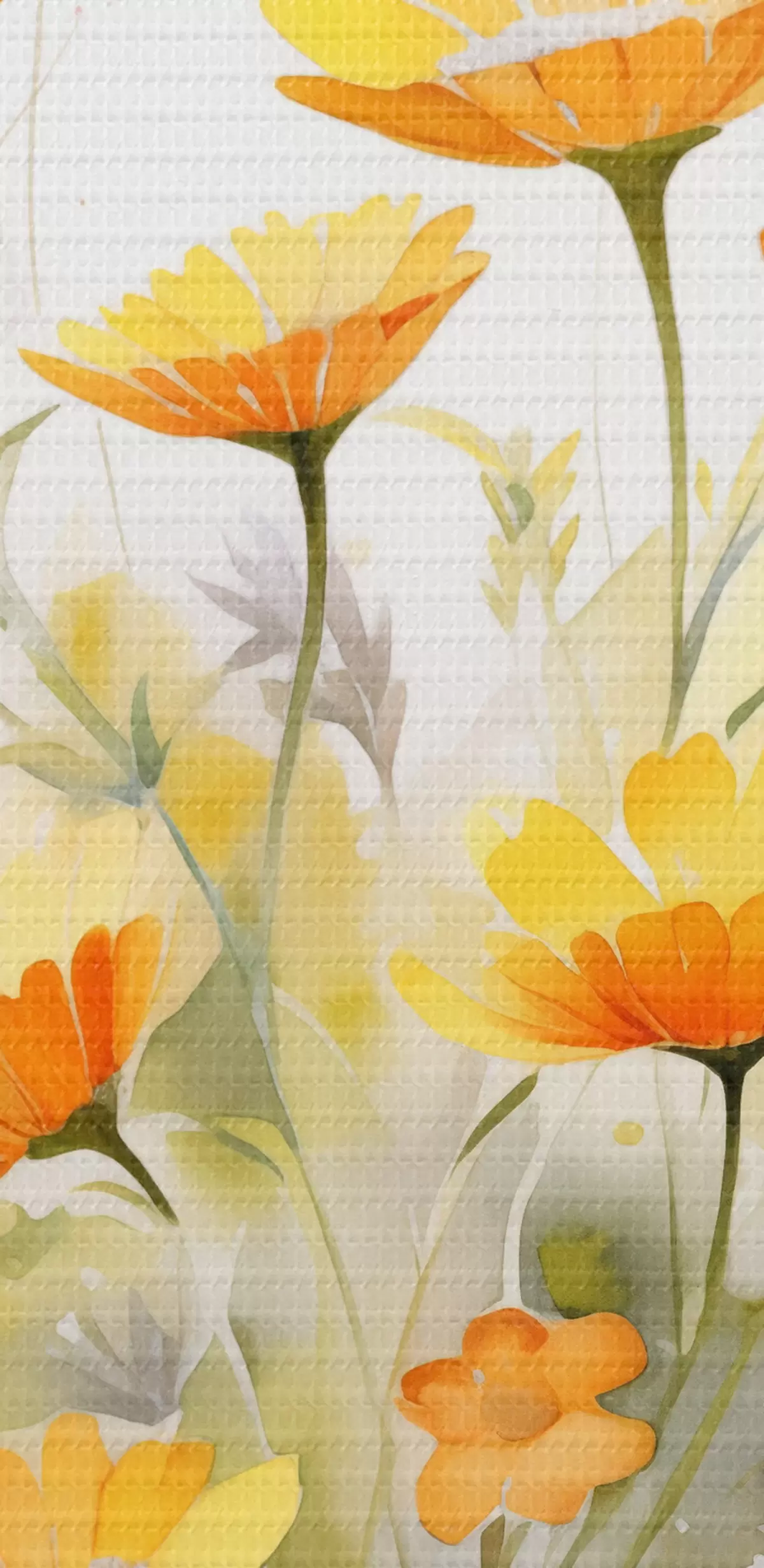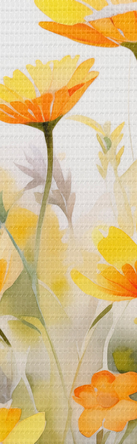 Vászonkép Élénk, akvarellszerű virágmező narancssárga és fehér margarétákkal, a közelben egy pillangó repked Nr s42714