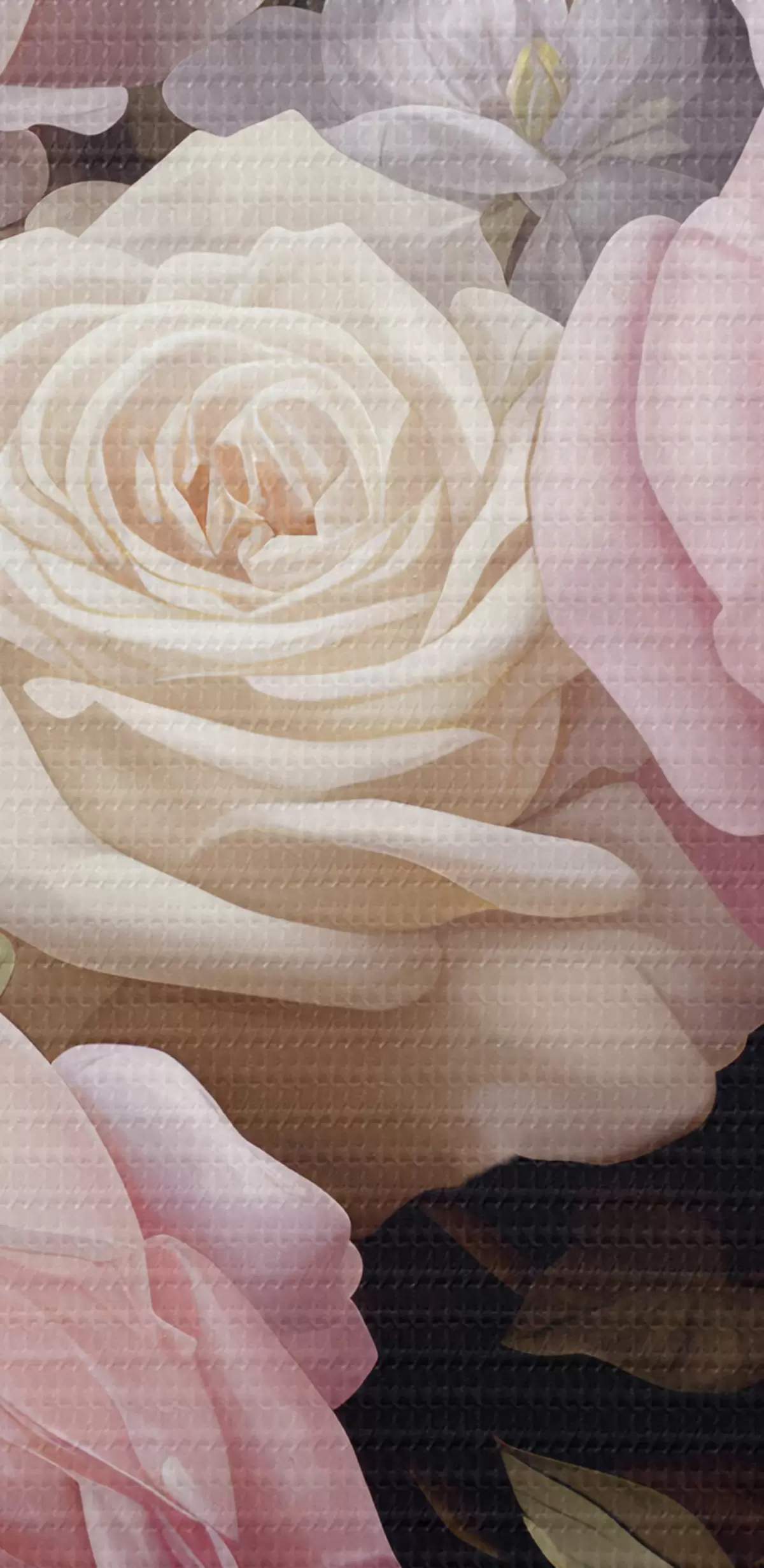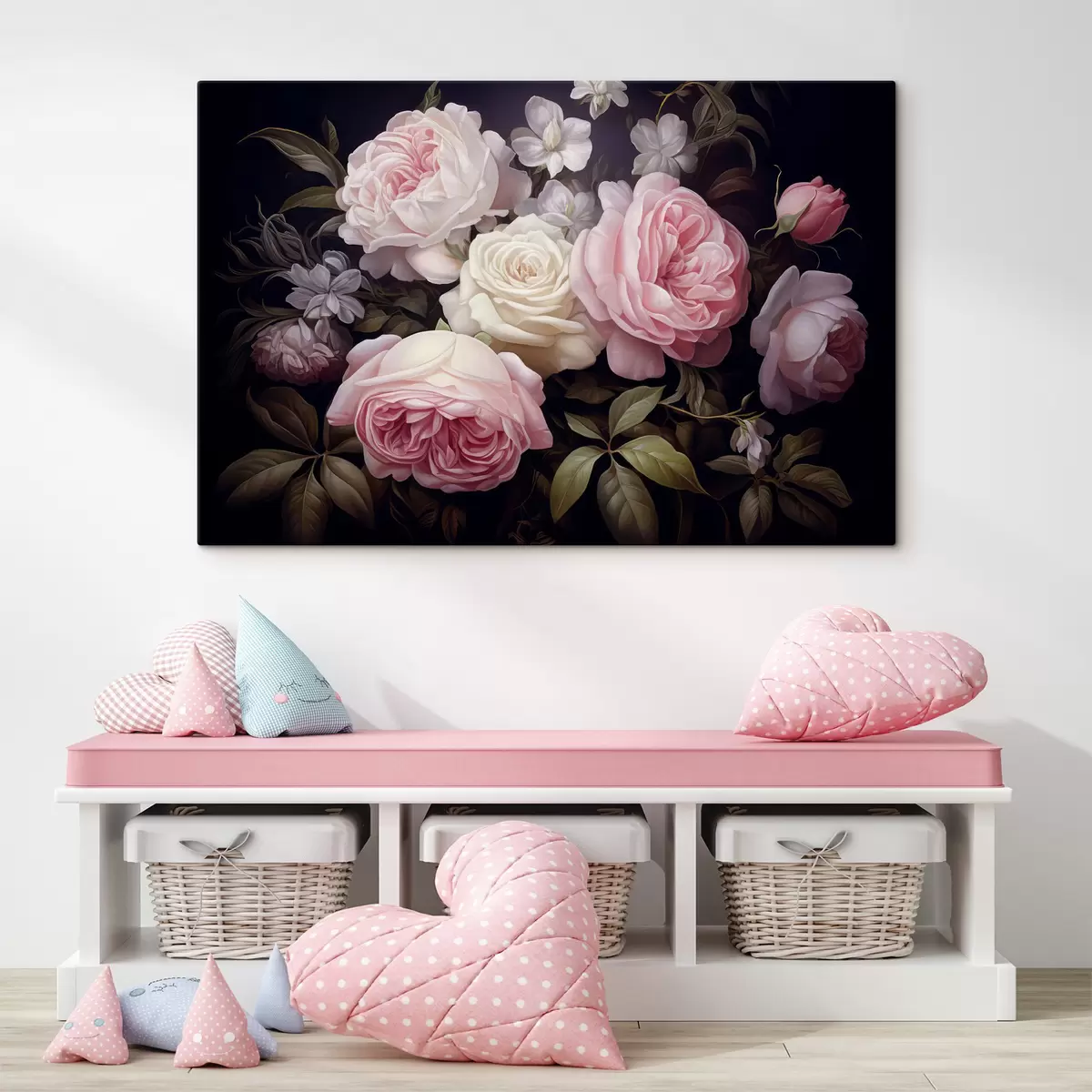 Vászonkép Rózsaszín és fehér rózsák, finom fehér virágokkal és zöld levelekkel elrendezve, sötét háttér előtt Nr s42721